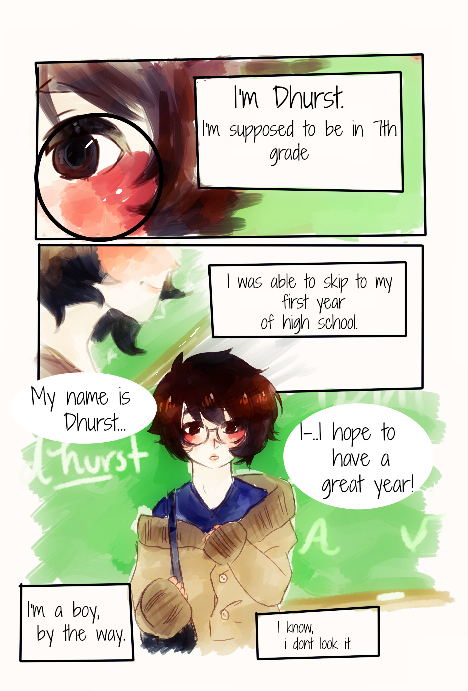 Dhurst was having his first, and new style of average, day at school; bullies, being called names, and having his shoes stolen. When one of the bullies suddenly starts to act strange and glancing over at him, will Dhurst get beaten up?