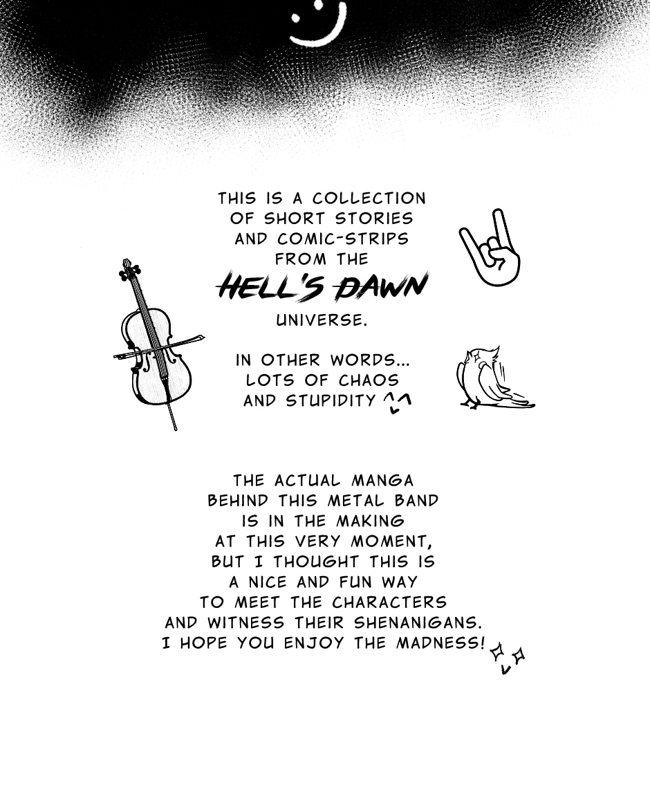 This is a collection of short comic strips featuring band members, friends and pets from the Hell's Dawn universe \m/