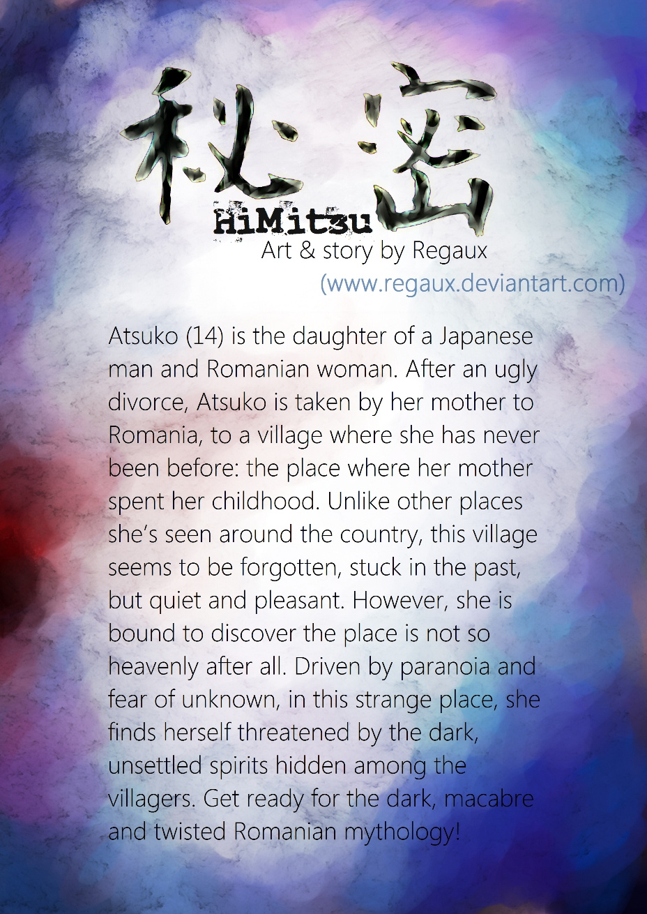 Atsuko (14) is the daughter of a Japanese man and Romanian woman. After an ugly divorce, Atsuko is taken by her mother to Romania, to a village where she has never been before: the place where her mother spent her childhood. Unlike other places she’s seen around the country, this village seems to be forgotten, stuck in the past, but quiet and pleasant. However, she is bound to discover the place is not so heavenly after all. Driven by paranoia and fear of unknown, in this strange place, she finds herself threatened by the dark, unsettled spirits hidden among the villagers. Get ready for the dark, macabre and twisted Romanian mythology!