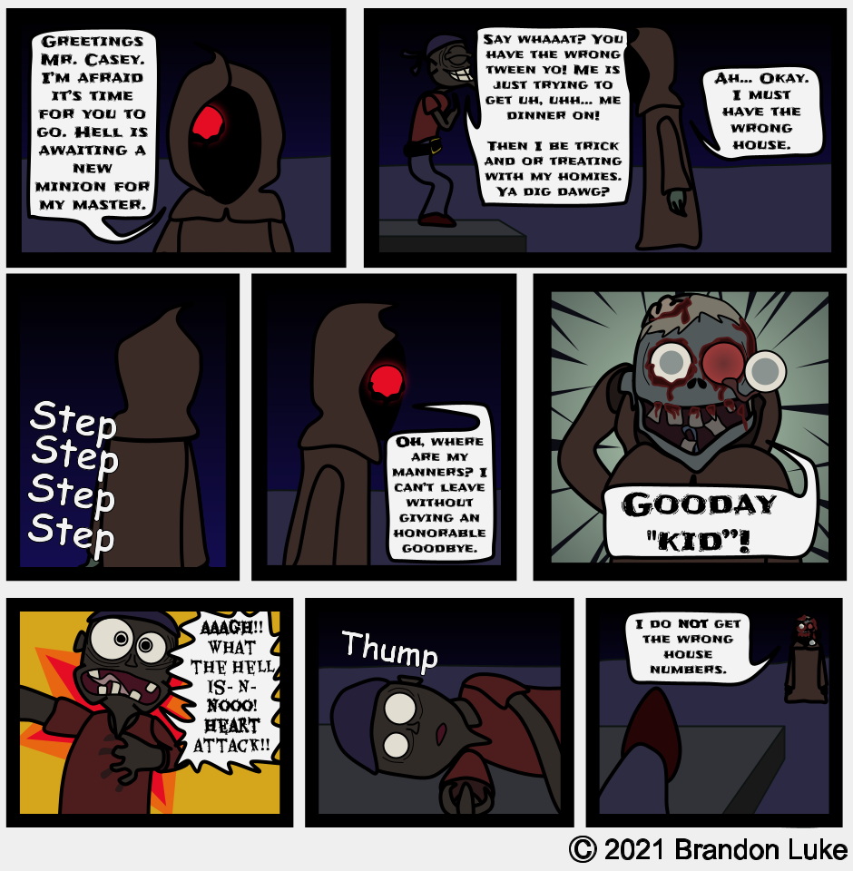 Good news! You'll have to wait about a month for each new strip to come out! So in the meantime, why not check out my comic series, Donnie The Fighting Psychopath. Yes, you theoretically will have to wait even longer for each new issue, but you get at least 18 pages of it each time. Plus an end strip called Jerry The Brain Gerbil. So check it out, or I'll get death to show up at YOUR doorstep. What? What master did you think he was talking about?