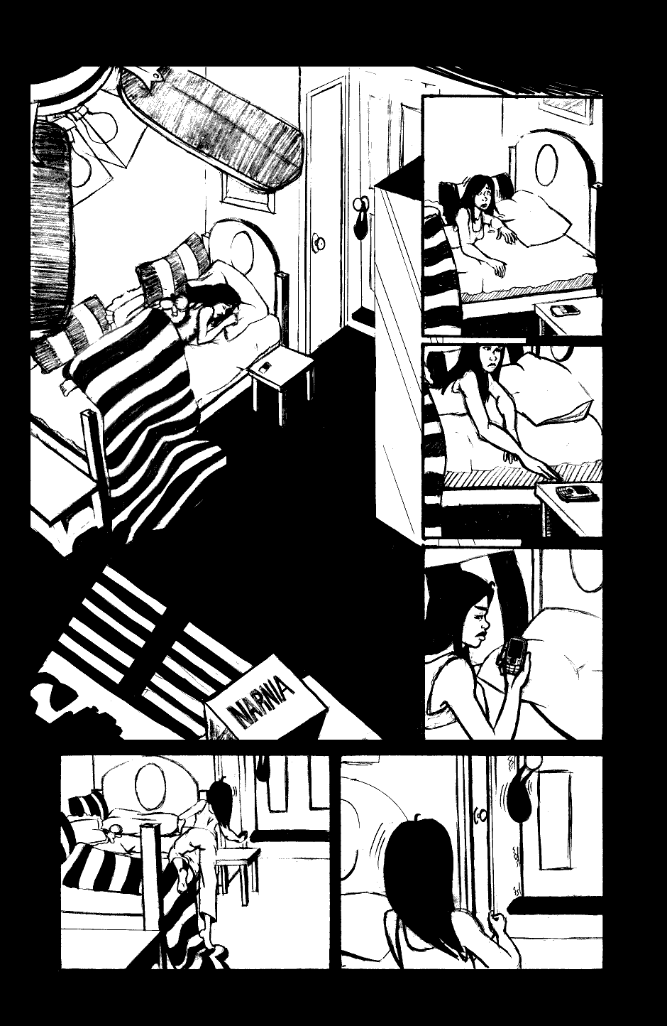 A silent comic. Evylyn wakes up to a loud noise outside her bedroom door. Her phone is dead and she's home alone, what to do?