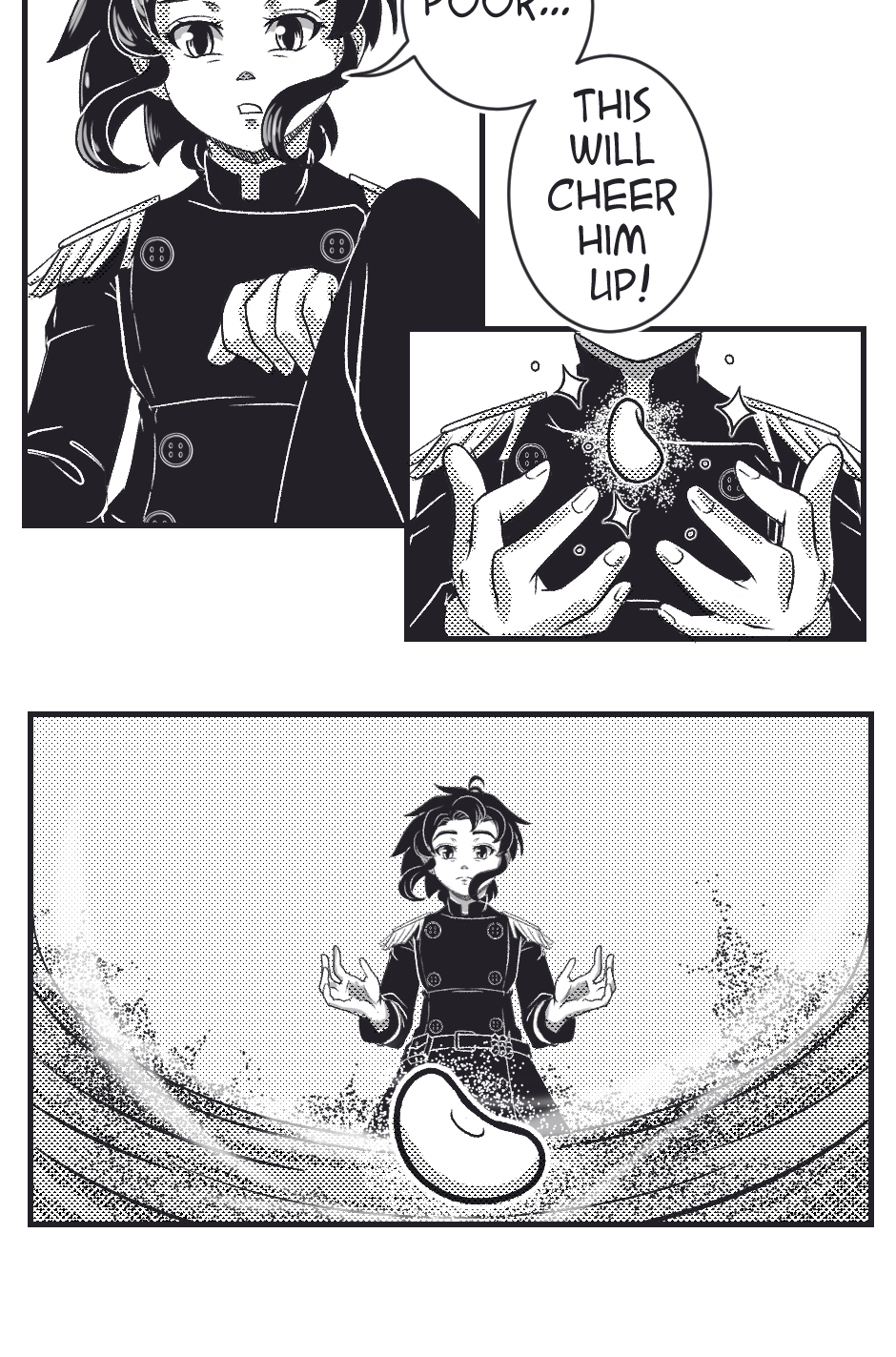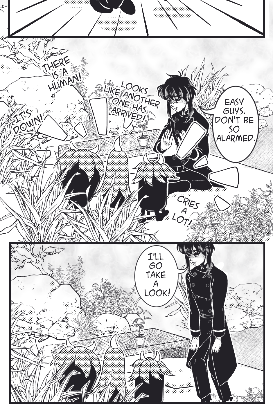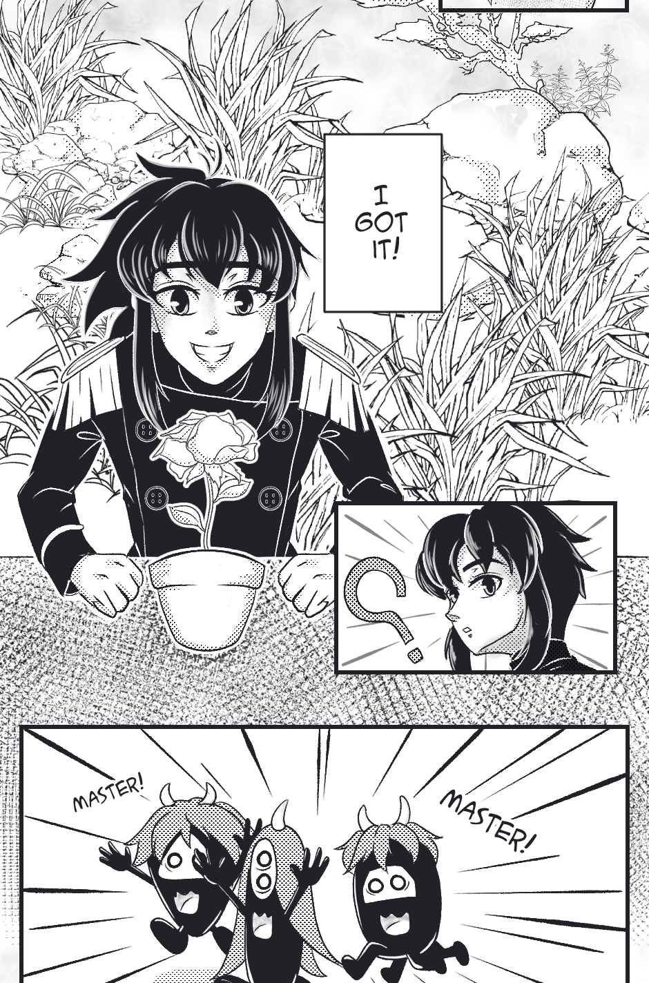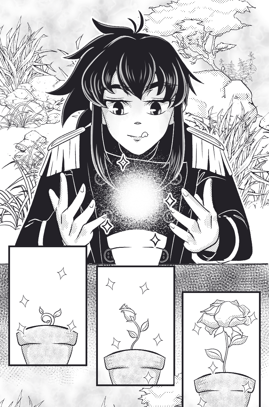 Están dentro del reloj de arena? Ya tengo varias preguntas! (*>°<) estoy emocionado por ver el siguiente capítulo, y la ilustración te quedó muy bonita! Me gusta el detalle, especialmente en los primeros panels con todas las plantas 🌿✨🖤✒️💖