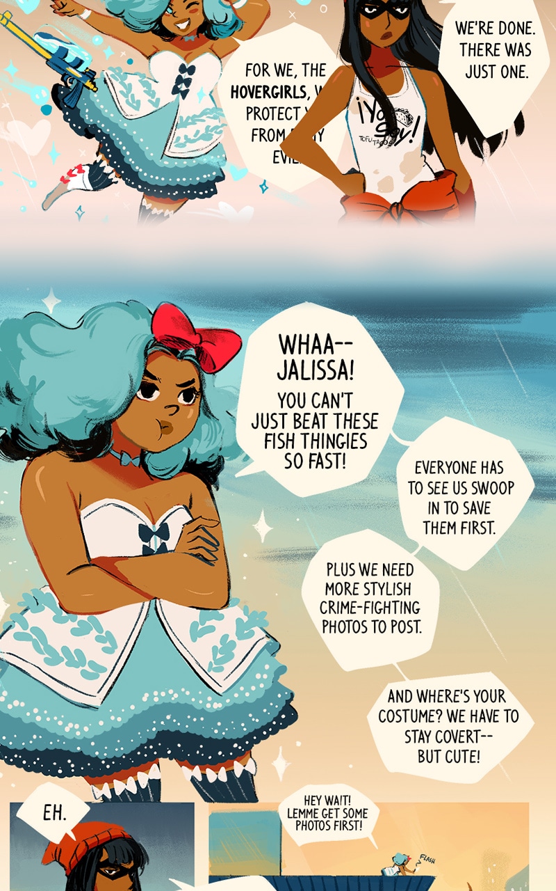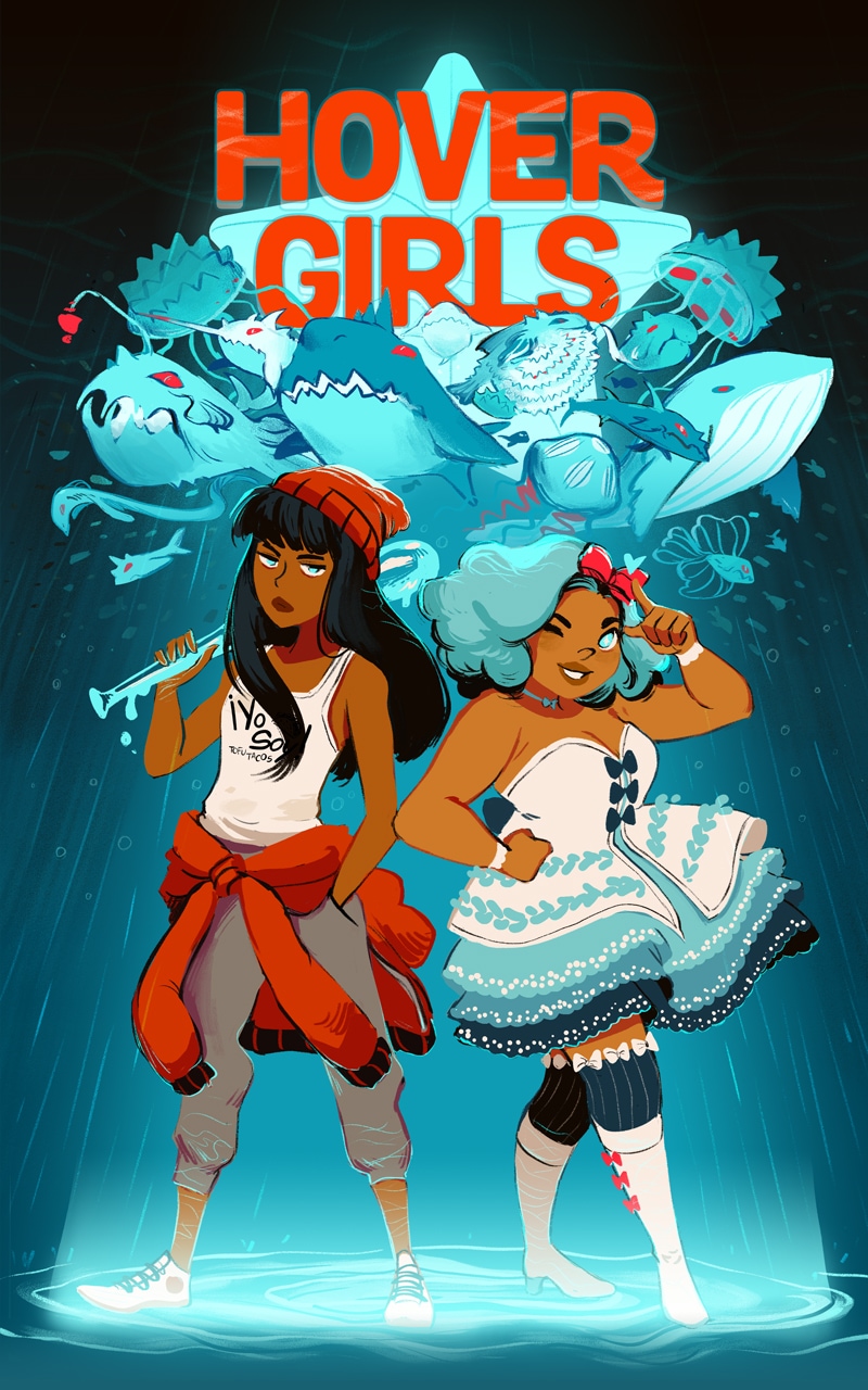 During the day, they both eke out a living as baristas at Big Chain Coffee, the world’s favorite coffee conglomerate. On especially torrential days, fish-like monsters wreak havoc on the city, and it’s up to the HoverGirls to stop them! But where are these monsters coming from in the first place?