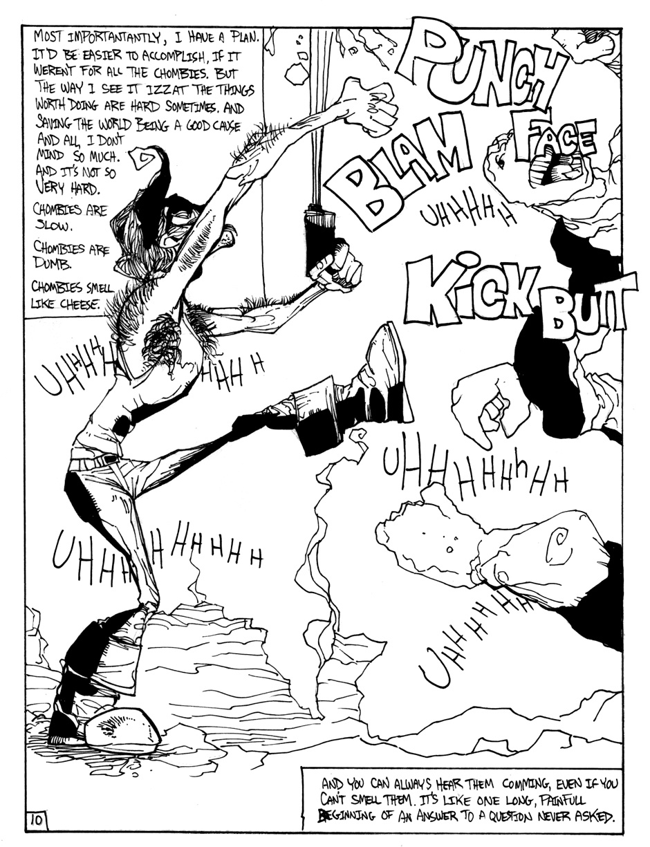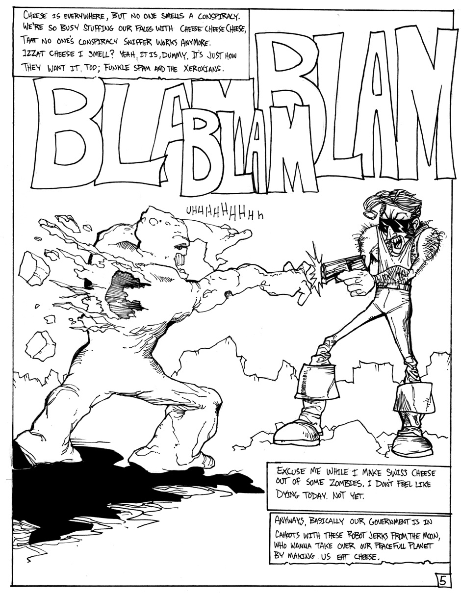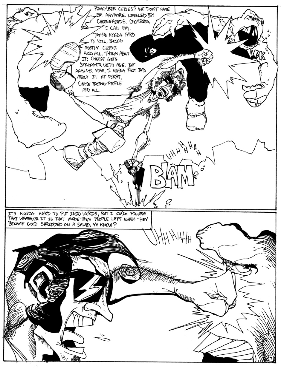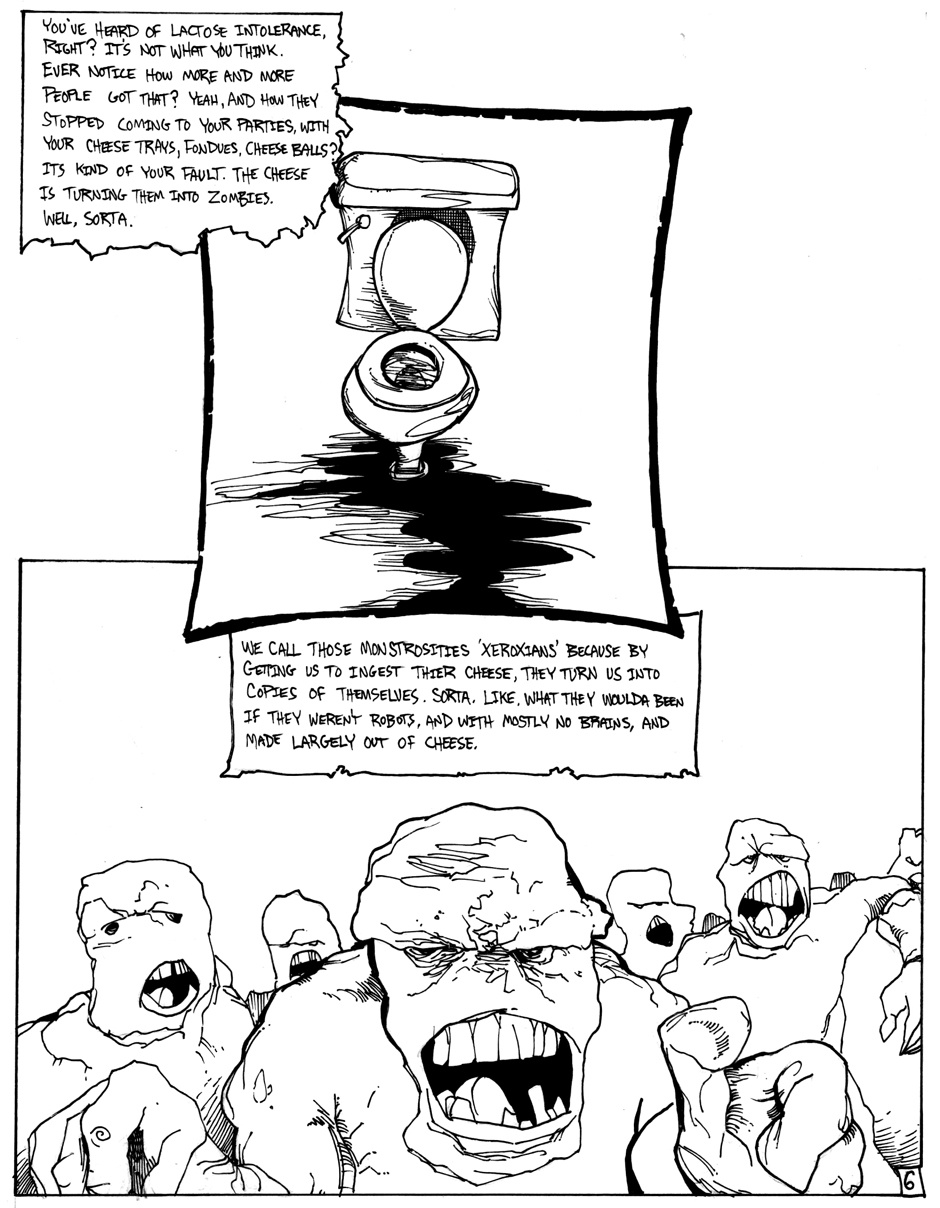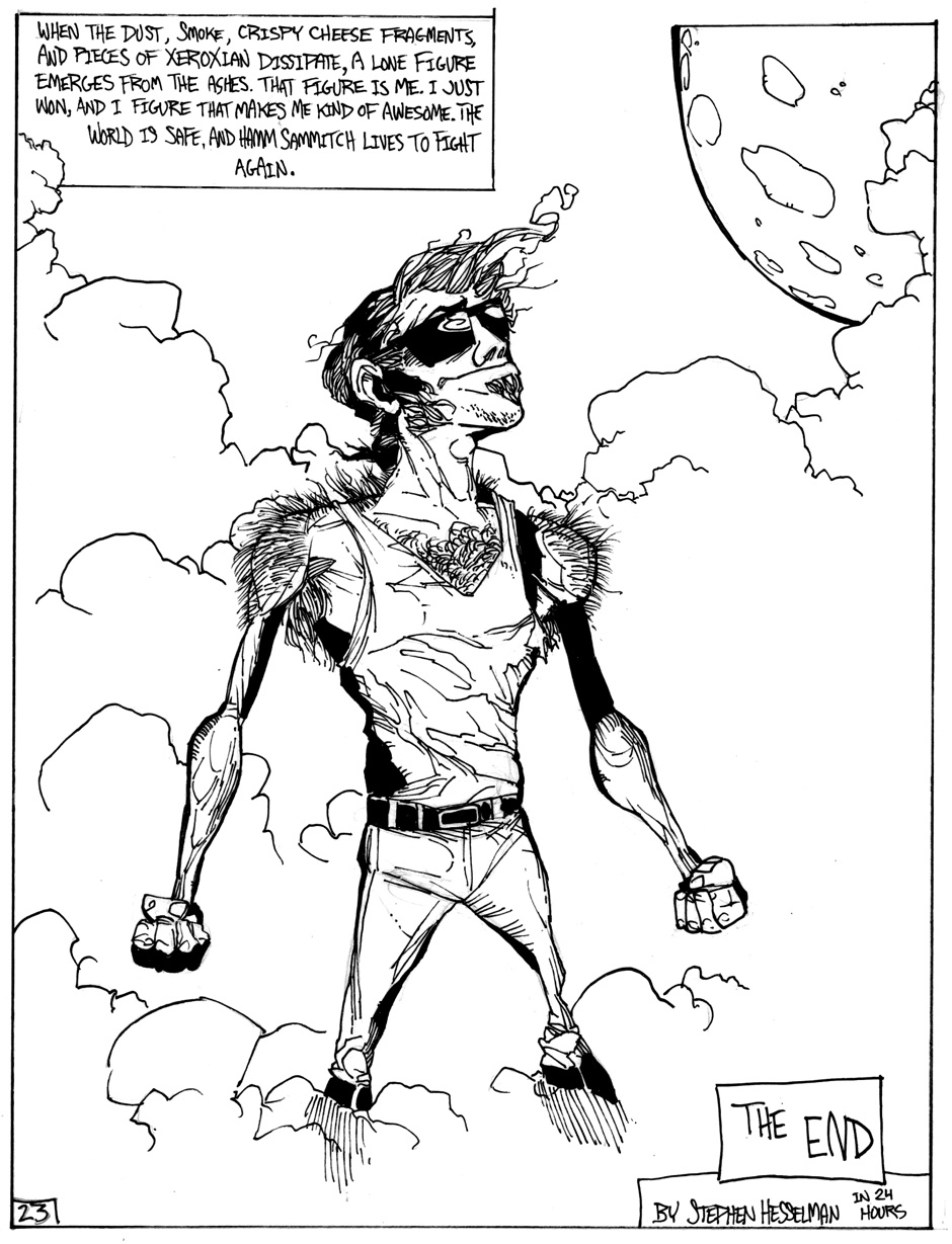 A story of good (sort of) triumphing over evil (definitely), featuring Hamm Sammitch, unlikely hero of a post-apocalyptic, cheddar-zombie infested world. And they aren't even the true menace orchestrating this dark, yet all-too-believable, probable future! Drawn in a 24-hour comic book challenge.