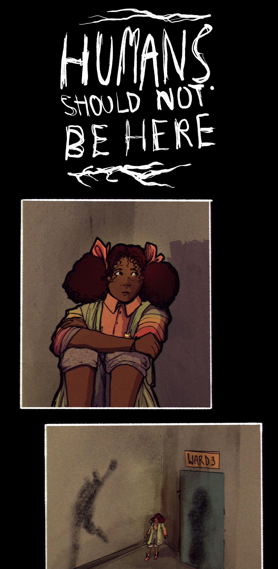this is the short comic i made for my final major project inspired by the decay of british hospitals and the fact I grew up around both these hospitals and a house full of mould courtesy of our neighbour's landlord, I was in my shower wondering what to do for my fmp until I looked up and saw the mould covering my walls and celling and from then on "Humans Should Not Be Here" was made.