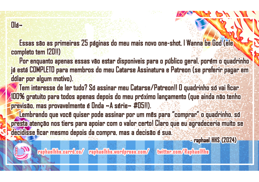 Hey! Como dito ali em cima, vai ficar disponível apenas essas primeiras páginas de graça, caso queira ter acesso ao resto do mangá acesse o meu Catarse: https://www.catarse.me/raphael_hhs