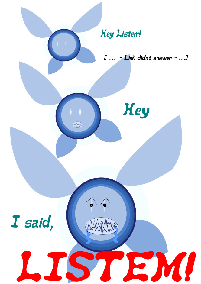 Legend of Zelda has been my favorite game since last year (yeah, because I just had money to buy a 3ds last year T.T), so this is a Navi version, the angry one, when we are playing and don't go to the right direction and Navi says: Hey Listem! and we keep going to the other side. I imagine an angry Navi when that happens.