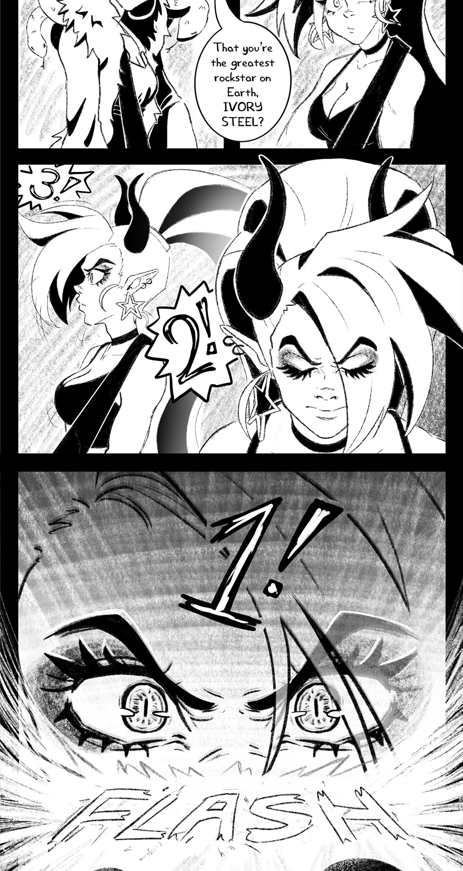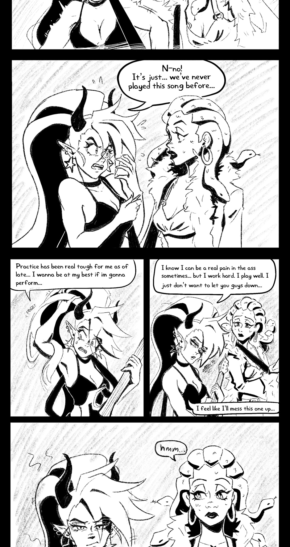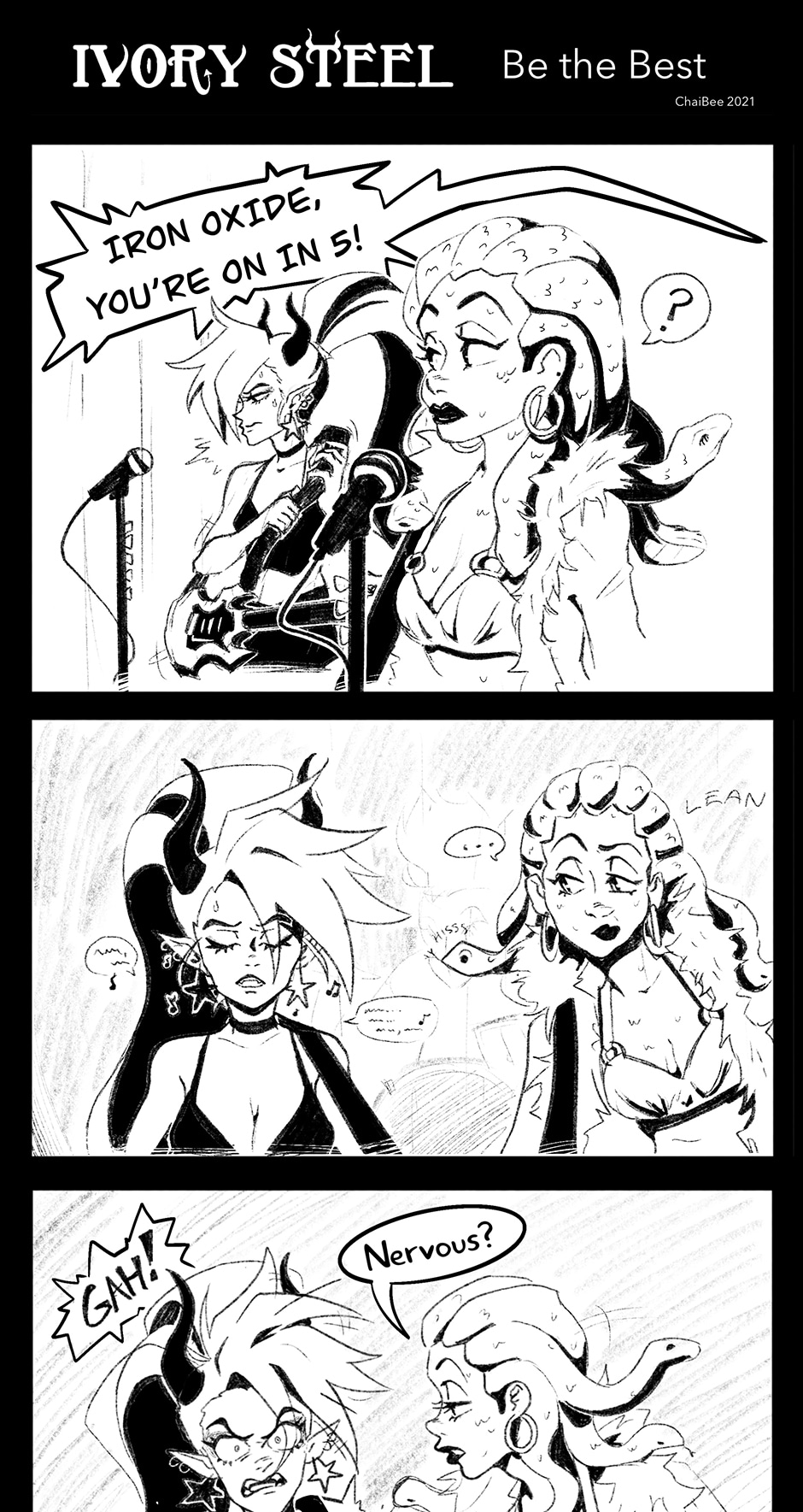 Ivory's not alone- along the way she meets two cool cryptids that formulate her band, IRON OXIDE. Featuring: The bassist, Dahlia, a gorgon college student trying to get by. The drummer, Specter, a ghoul with freaky flame hair and a chill vibe.