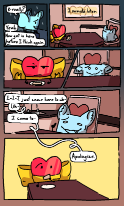 This was made as sort of a "Metallic-2 weeks later" comic, sorry if it's hard to understand! Basically, after a competition show, Icey realizes the error of her ways and apologizes to Valentines. That's it.