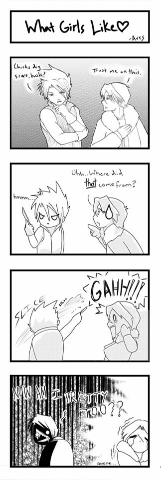 Featuring FFVII's Cloud Strife and FFVIII's Squall Leonhart. Cloud attempts to up his bishie game.