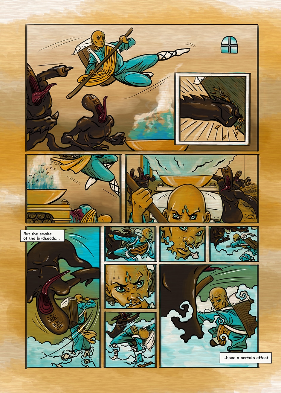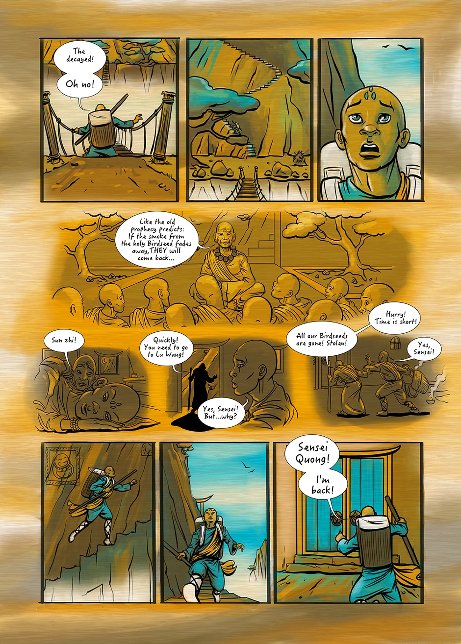 Once again a preposition. Young Sun Zhi is on his way to bring the dearly needed birdseeds to his monastery up in the chinese mountains. On his way back, he encounters, that he is too late and the worlds fate is at stake.
