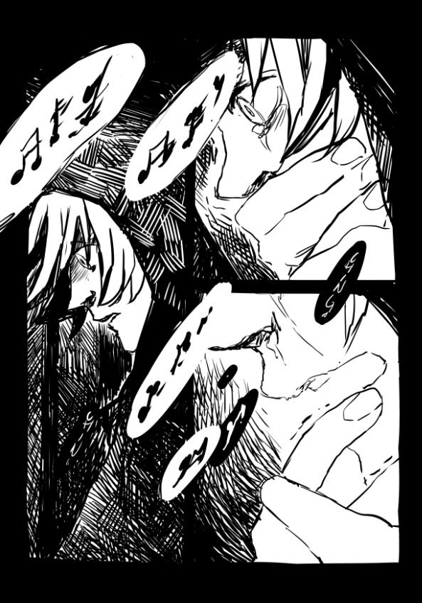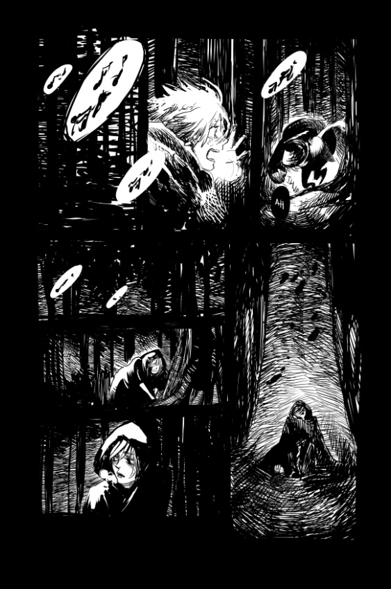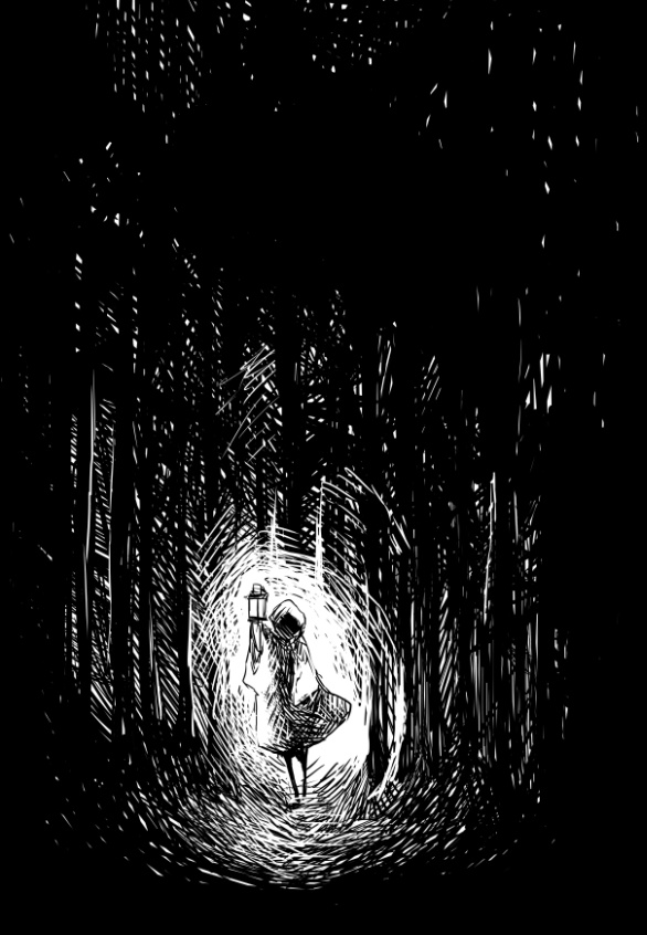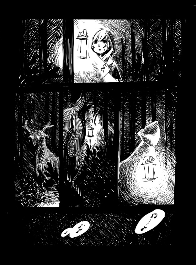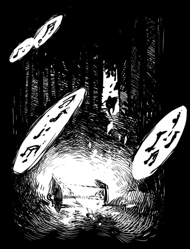 "In The Woods" is a dream I had a couple of weeks ago. It's been bothering me ever since, so I decided to draw it directly out of my memory and didn't prepare any drafts beforehand. I don't remember the melody or song but let me try to describe it: It pierces through your mind and hurts. So much, that you try to get rid of it by singin along..