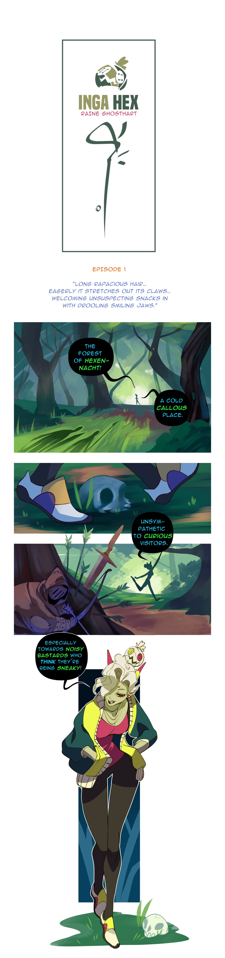 The forest of hexennacht is home to various supernatural creatures as well as Inga, a witch who protects its inhabitants from those who wish them harm.