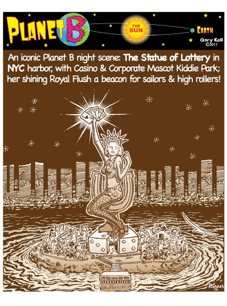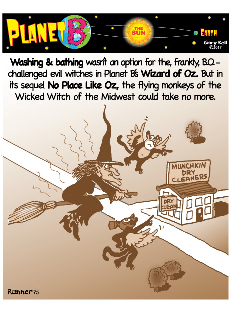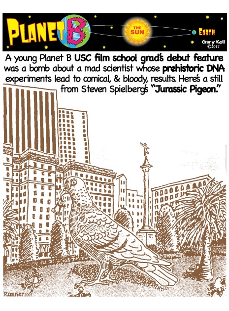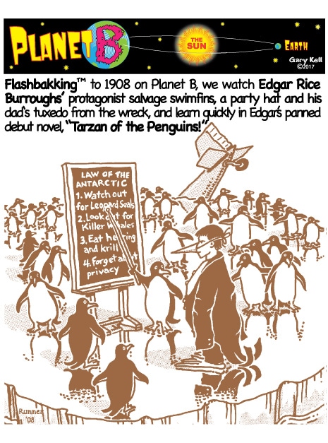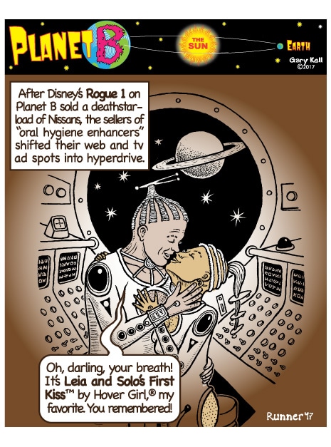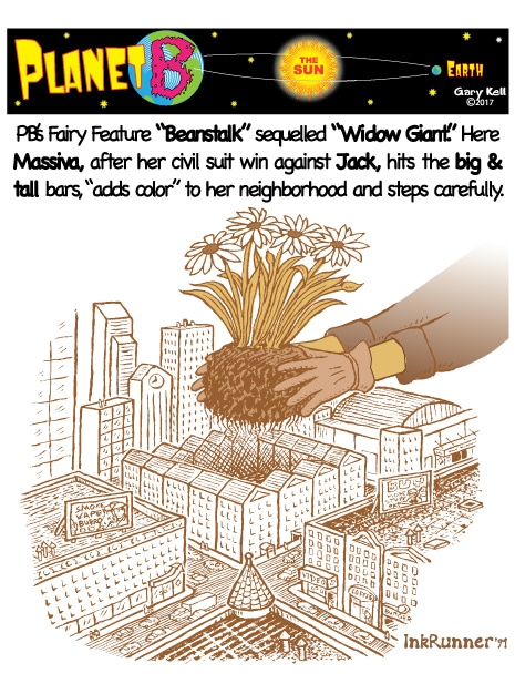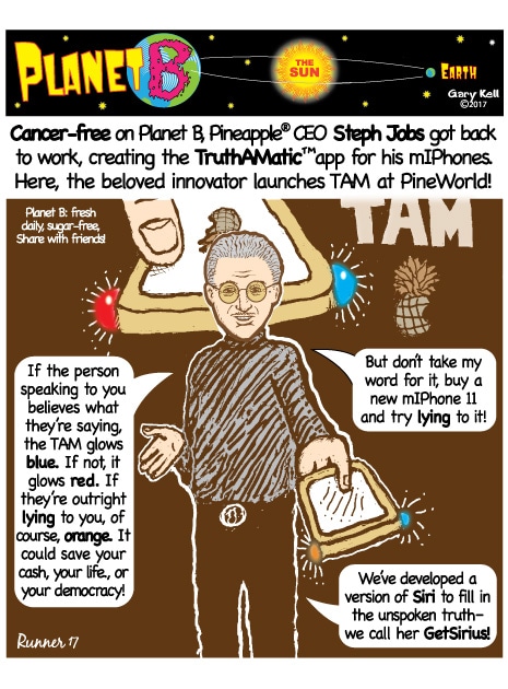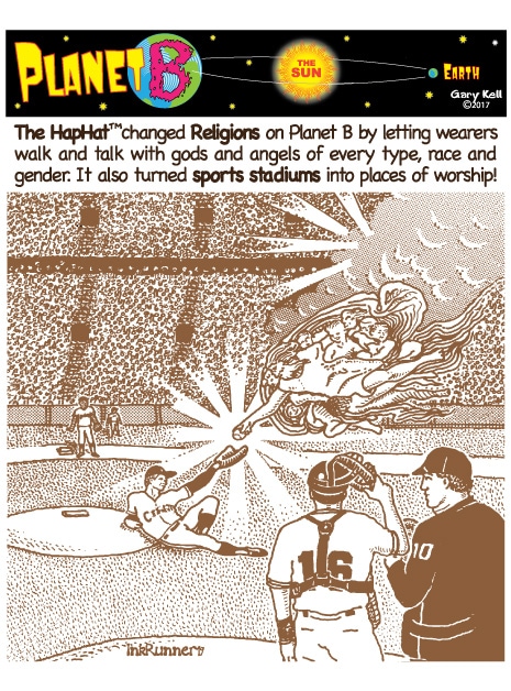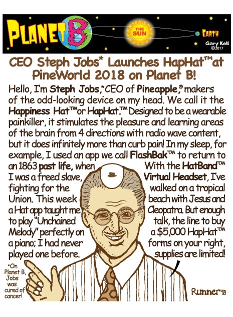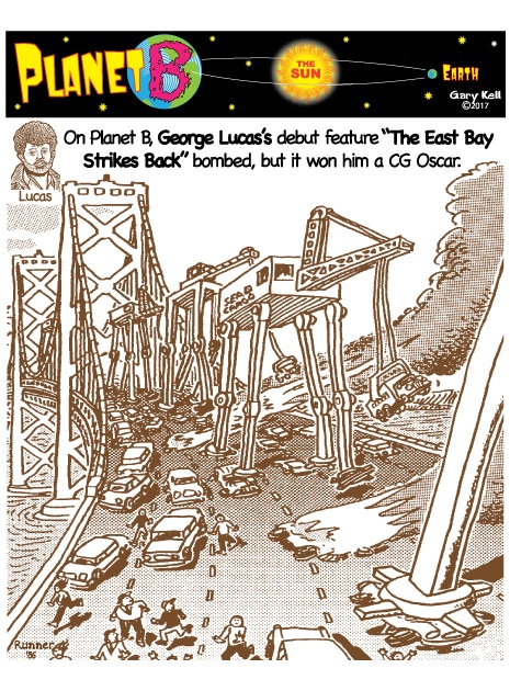 Gary, underpaid Mill Valley cartoonist, bored, emails himself and meets his double, InkRunner, on Planet B, on the opposite side of the Sun, who replies with stunning brown-tinted toons, and finds that Steph Jobs lives on Planet B!