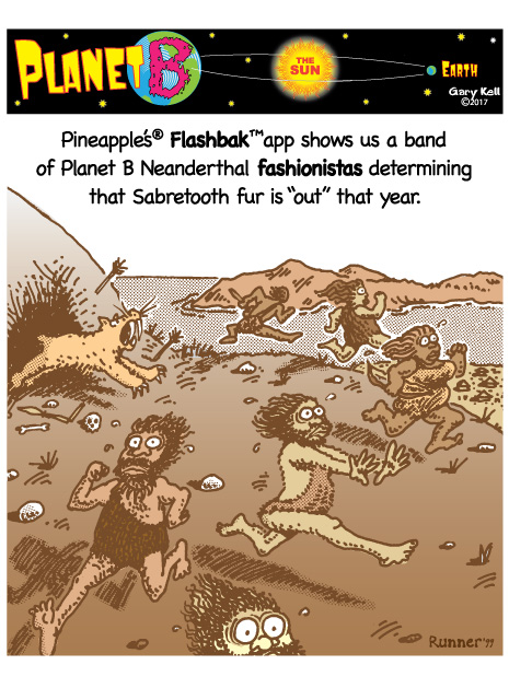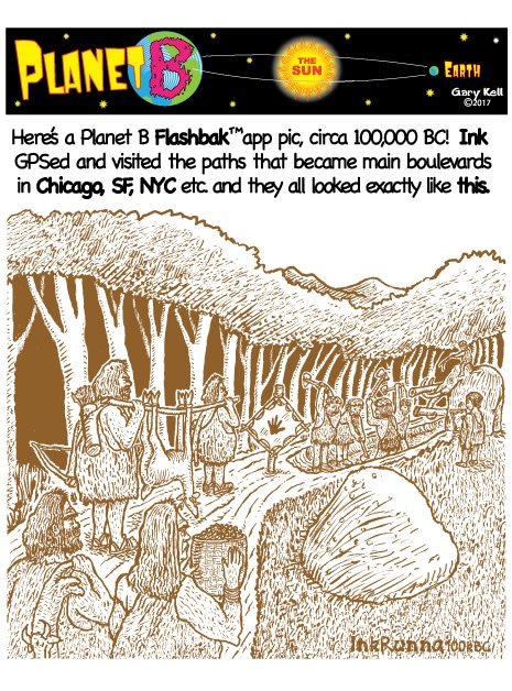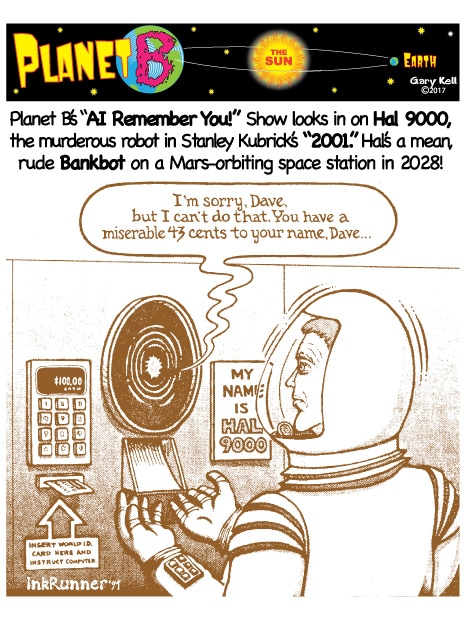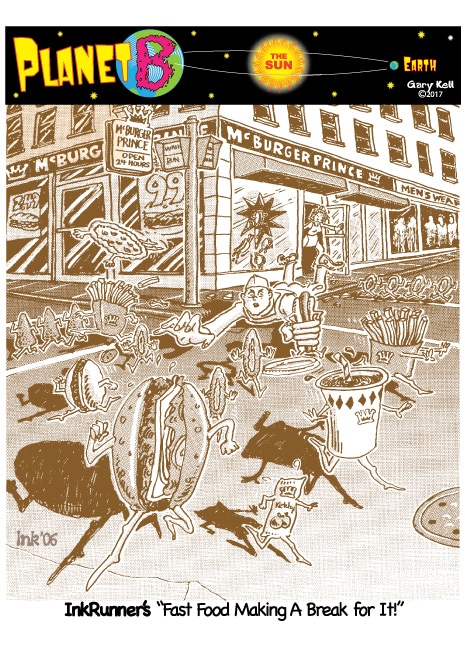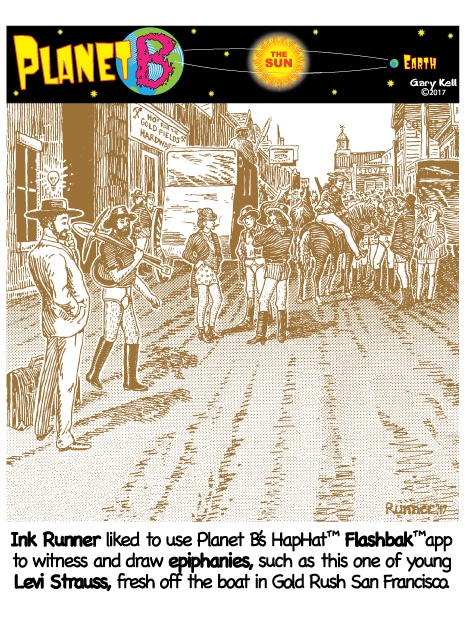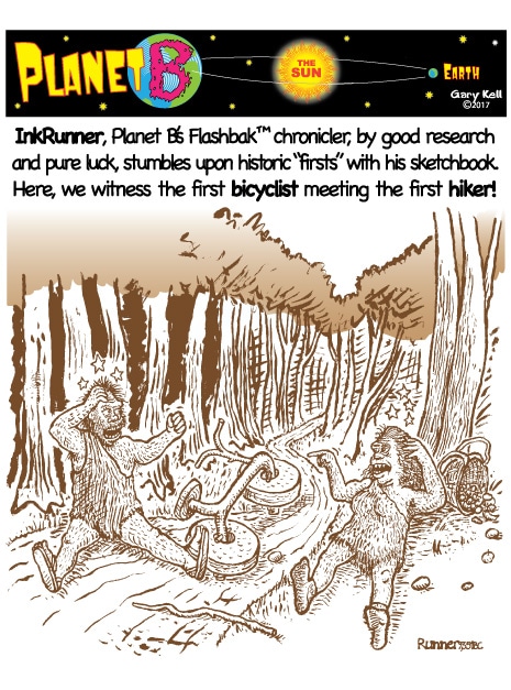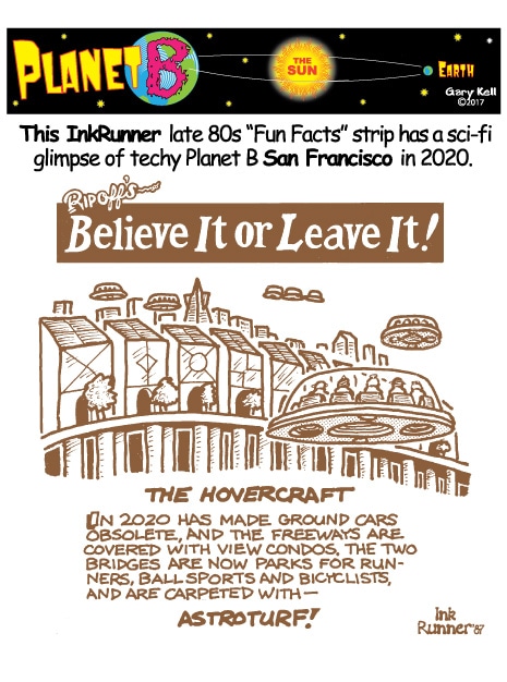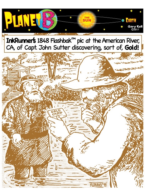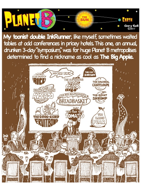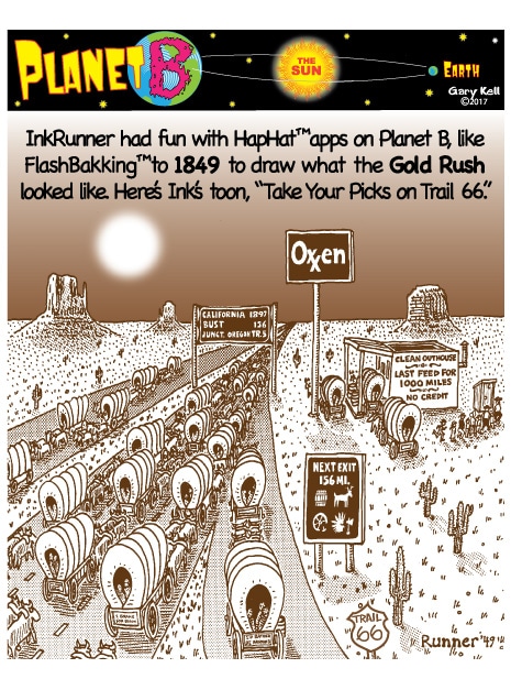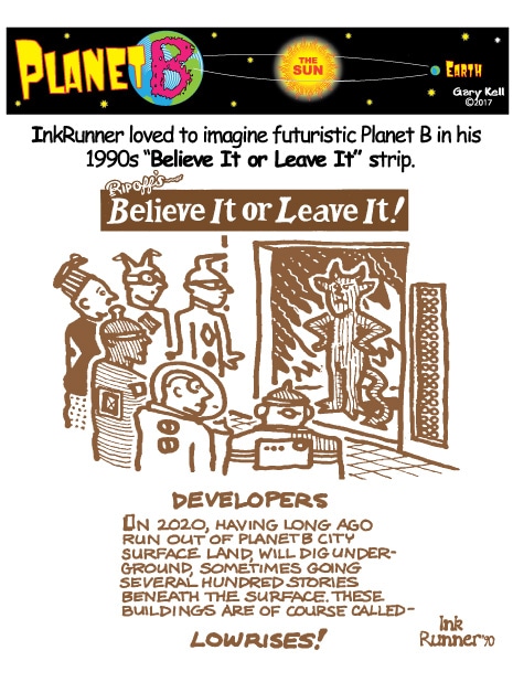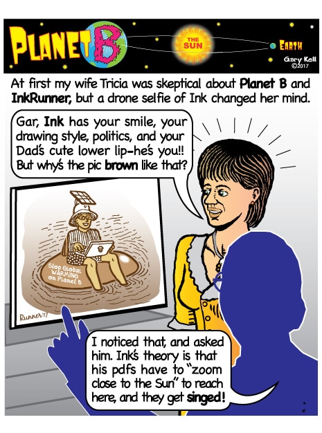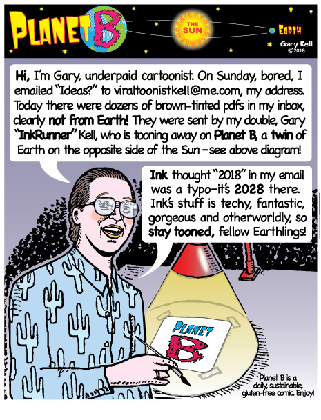 Hi folks, I'm Gary, underpaid Mill Valley Valley cartoonist. Last week, bored, I emailed myself, asking for ideas, and received dozens of brown-tinted toons from my double on Planet B, also Gary, but he calls himself InkRunner! It's 2028 there and his stuff is good, futuristic, funny, time-bending and daily. Enjoy!
