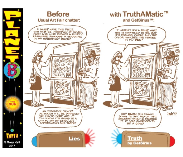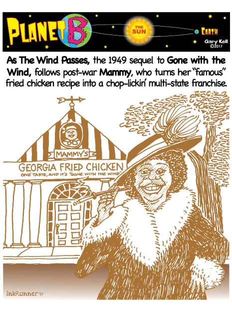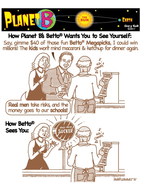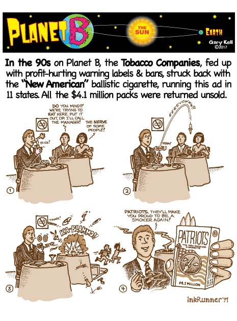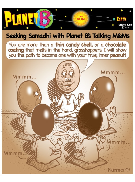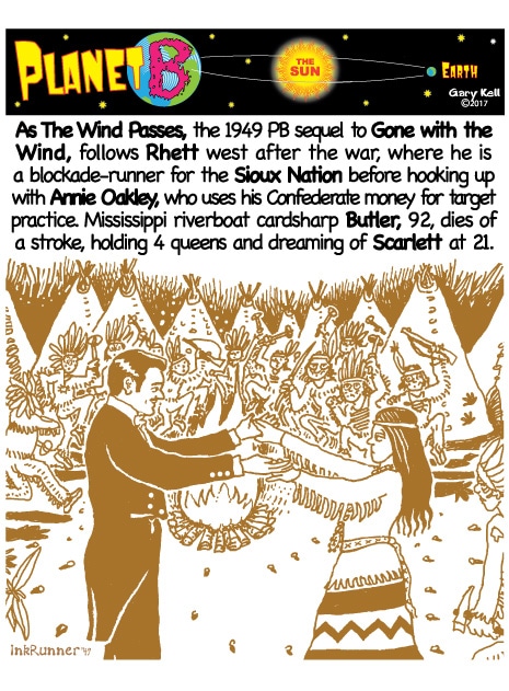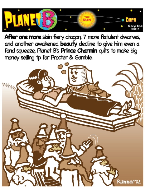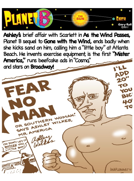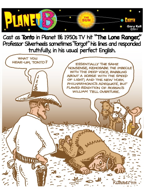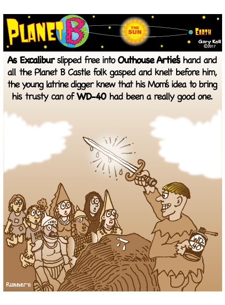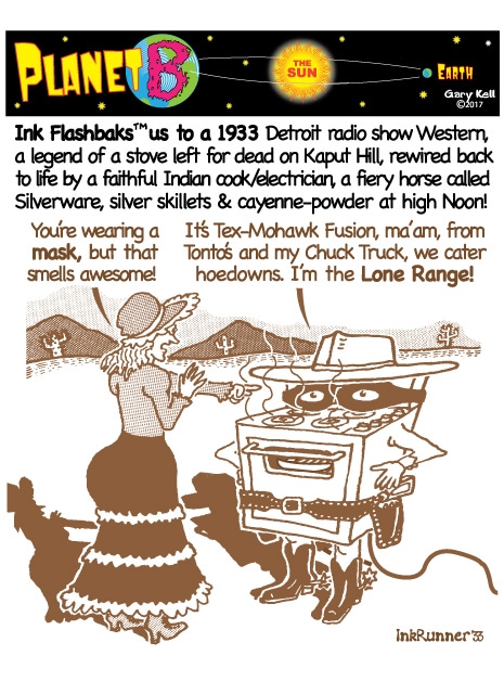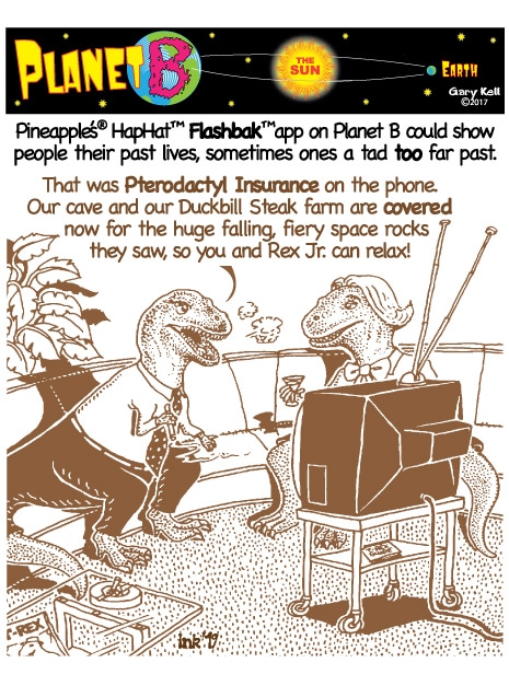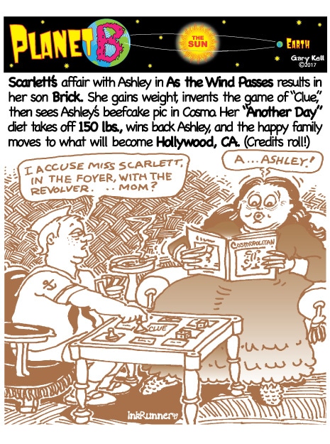 Hi folks, I'm Gary, underpaid Mill Valley Valley cartoonist. Last week, bored, I emailed myself, asking for ideas, and received dozens of brown-tinted toons from my double on Planet B, also Gary, but he calls himself InkRunner! It's 2028 there and his stuff is good, futuristic, funny, time-bending and daily. Enjoy!