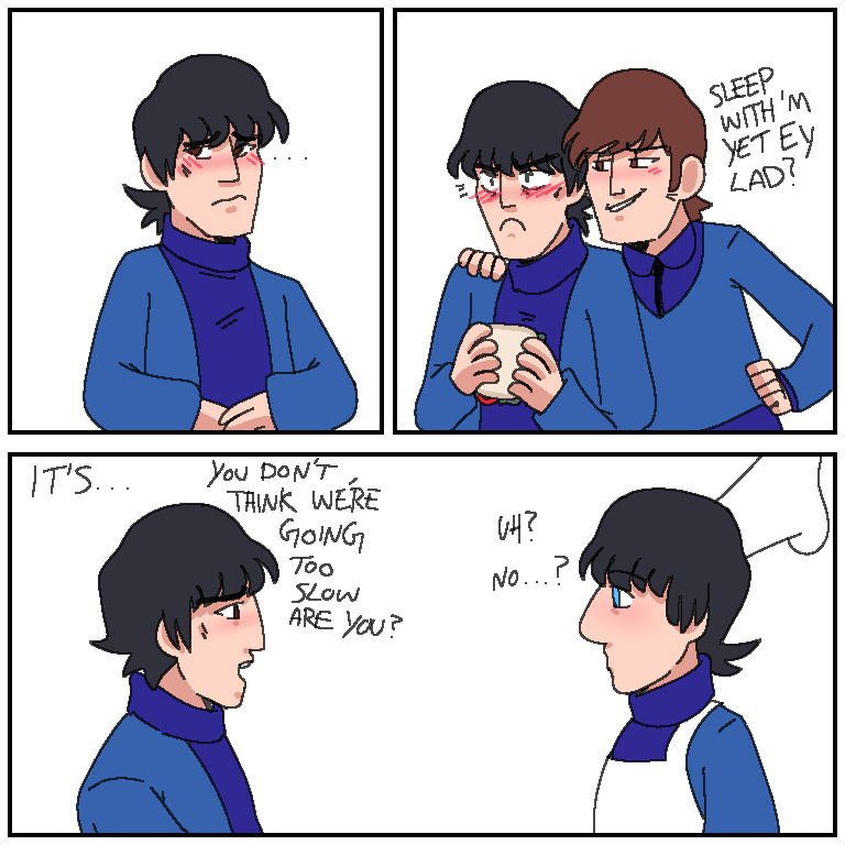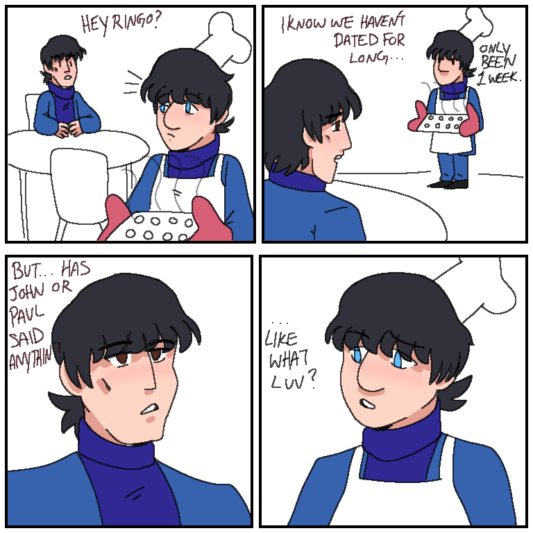 This is just a silly little comic about George and Ringo figuring out their new relationship. Meanwhile their other bandmates might've taken things too fast with their own relationship, George and Ringo rather take things slow.