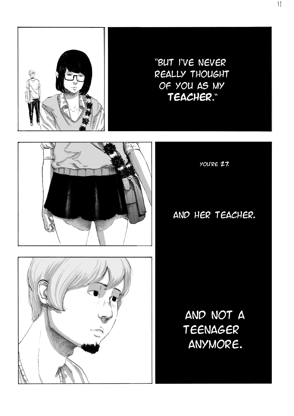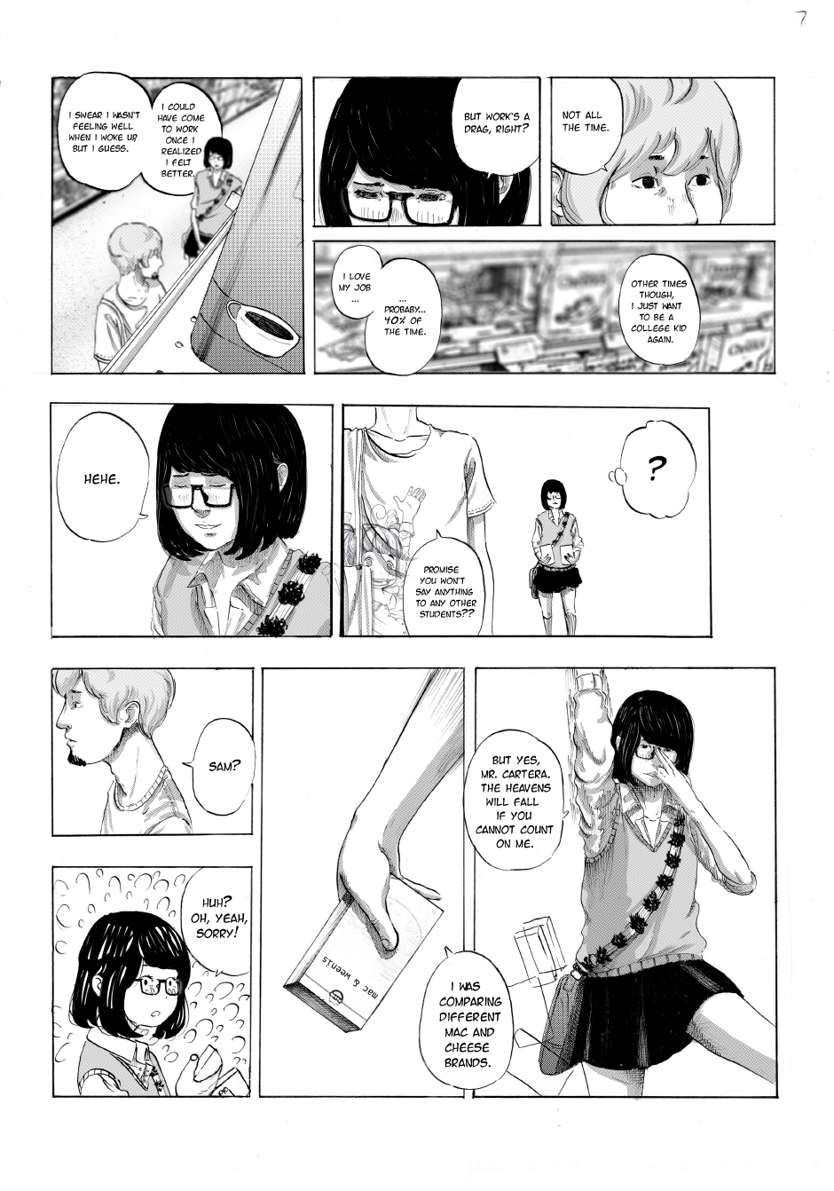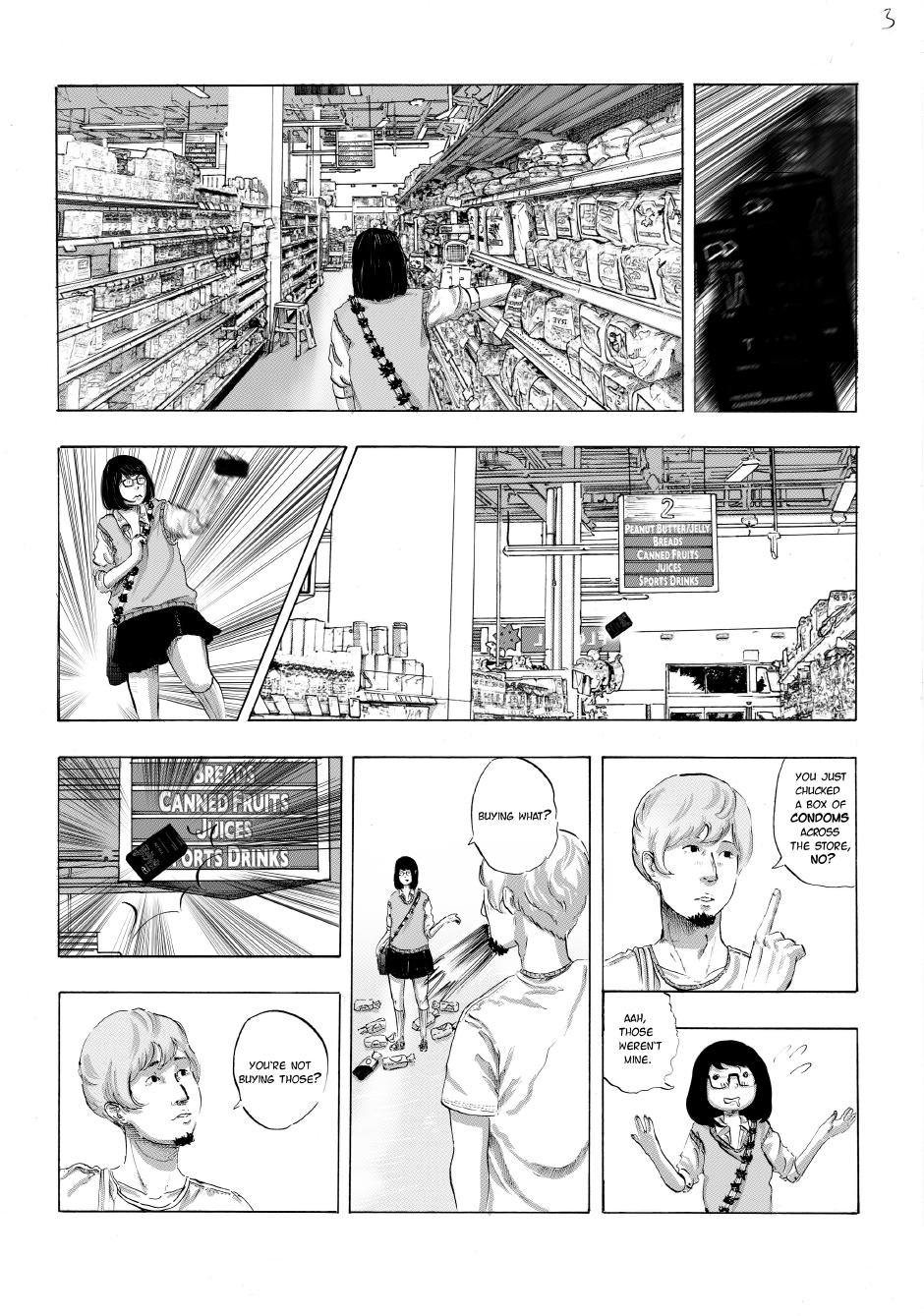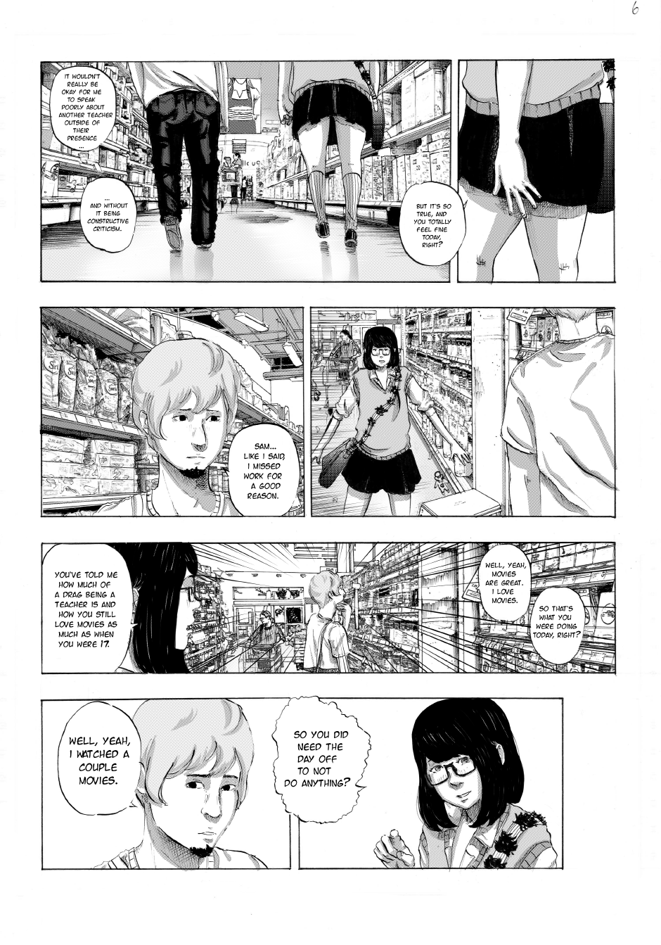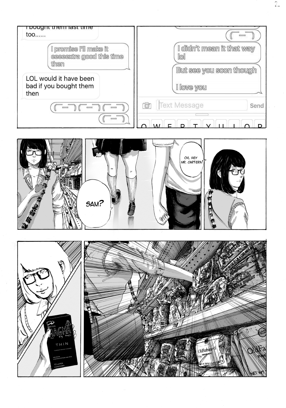 17 year old female high school student Sam is shopping for condoms at the local supermarket when she runs into her friend-of-a-teacher, Mr. Cartera. He was absent from school on this day, and Sam has a hunch as to why.
