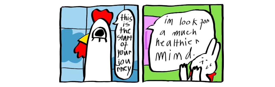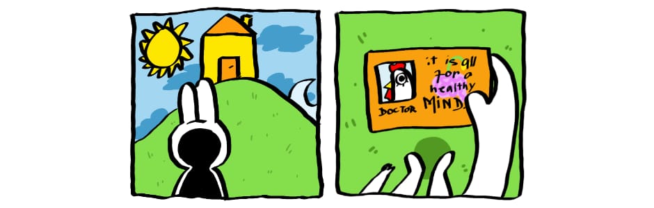 Rabbit Jade decides that looking for a therapist is best for them right now . In their searches , they stumble upon Doctor , an easygoing chicken , eager to help in the clinic up on the hill . And climbing it up means only the start of Jade's journey in look for a better self .