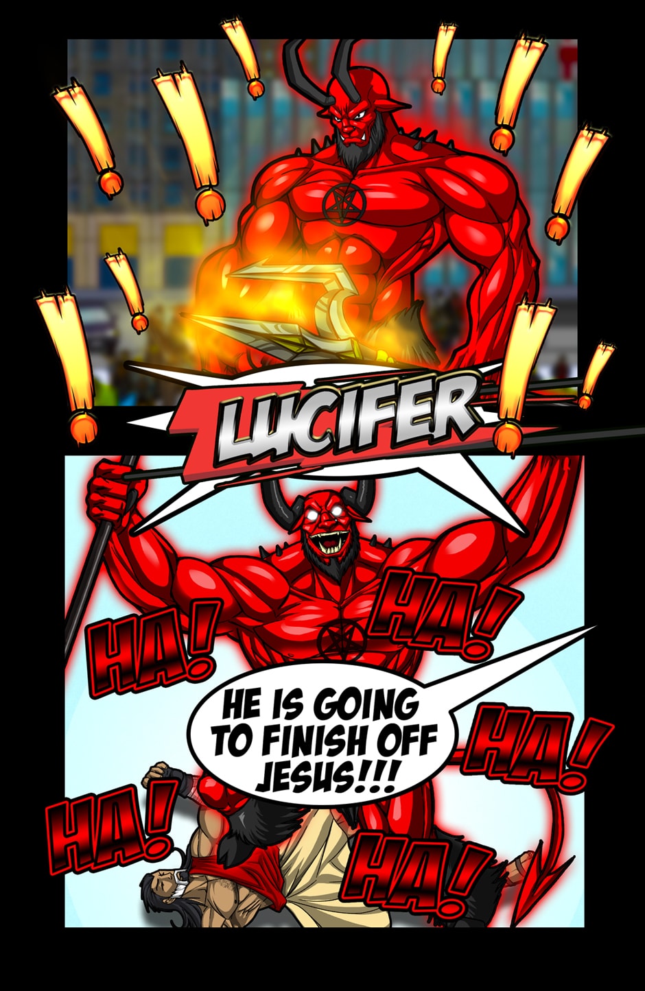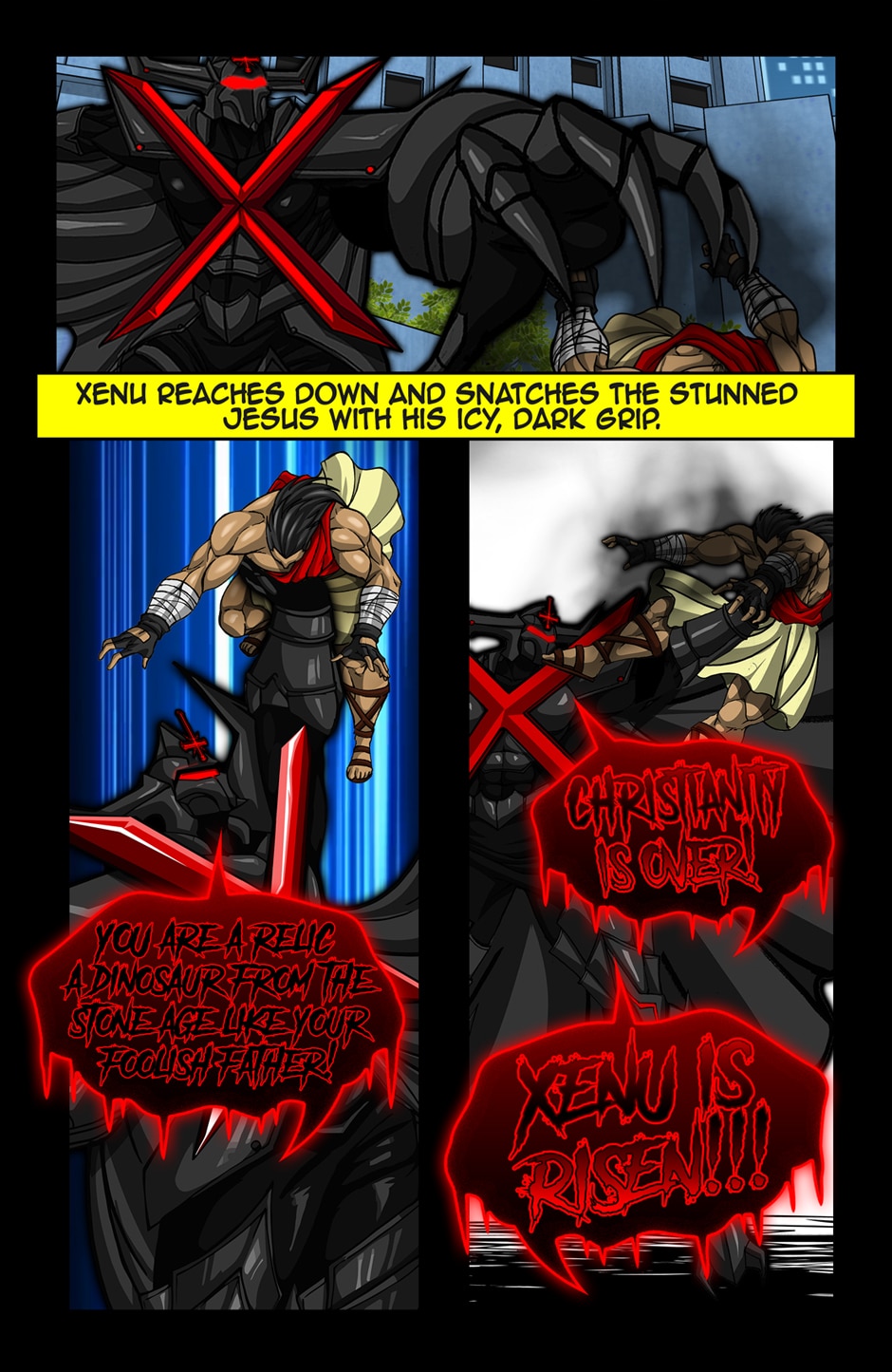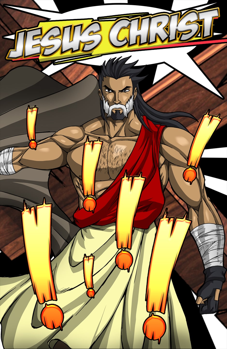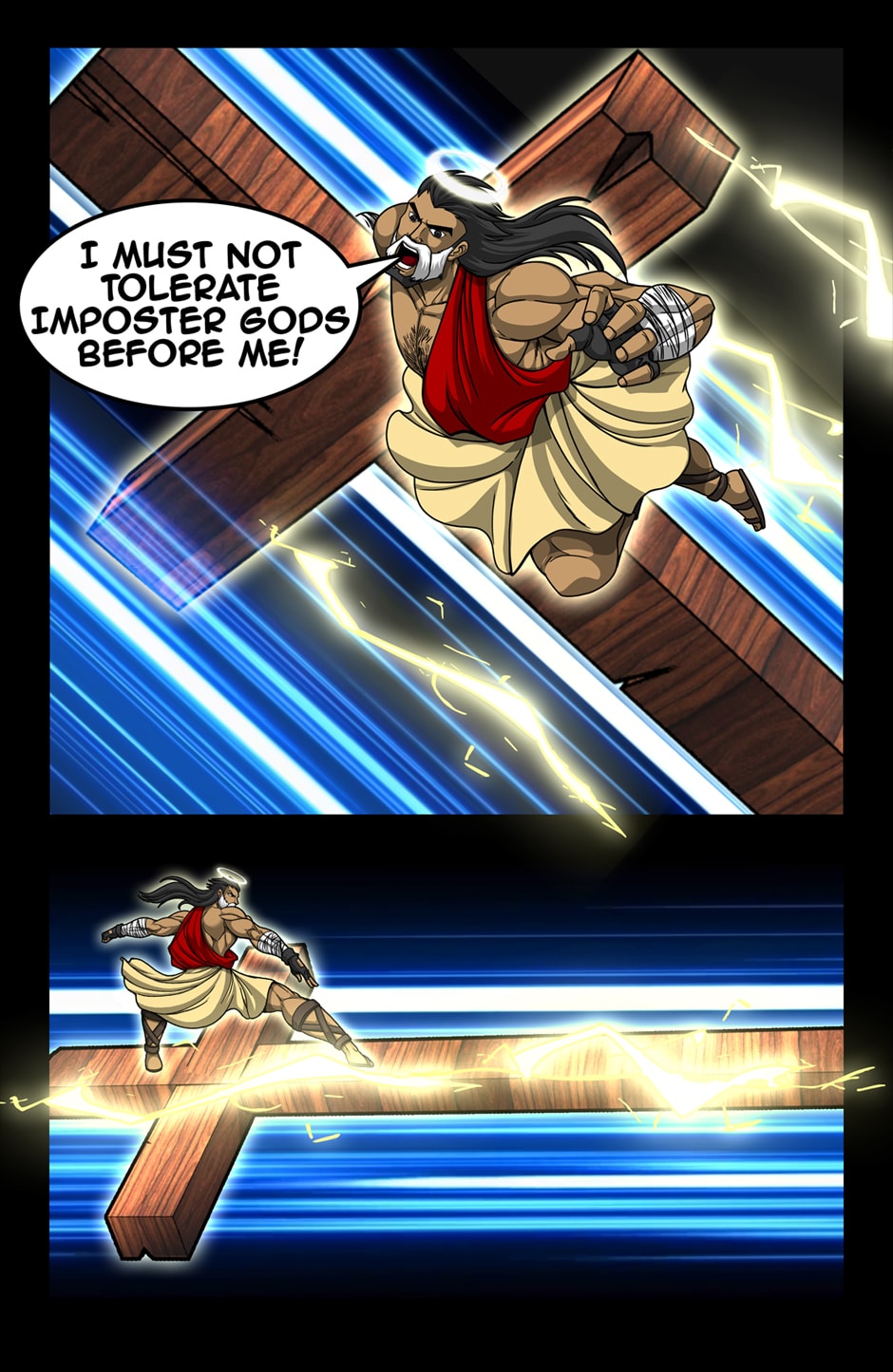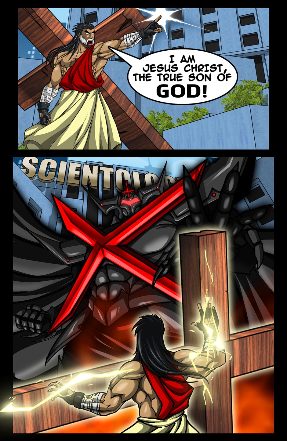 OH MY GOD YES!!! THIS IS AMAZING! The Art, the CONCEPT, the fact that JESUS IS A MUSCULAR WARIOR MAN who fights with a LIGHTNING CROSS!!! THIS IS PERFECTION!