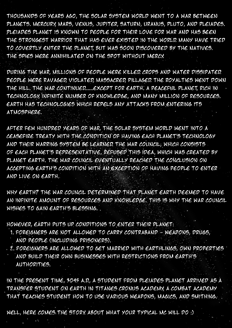 Dione Claudia, whose descendants are warmongers from Pleiades, came to Earth to learn the essentials of life and its surroundings. During his study, he met many comrades that change his way of thinking. However, during one of the lessons, he felt something strange inside his body; something swelled up and....