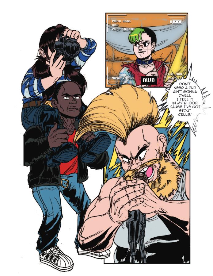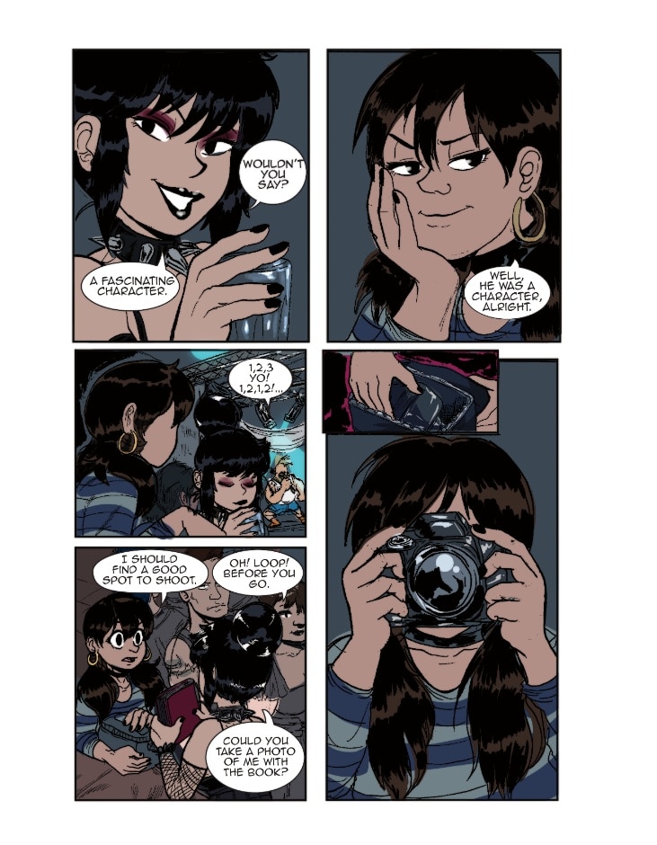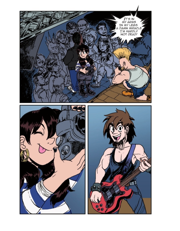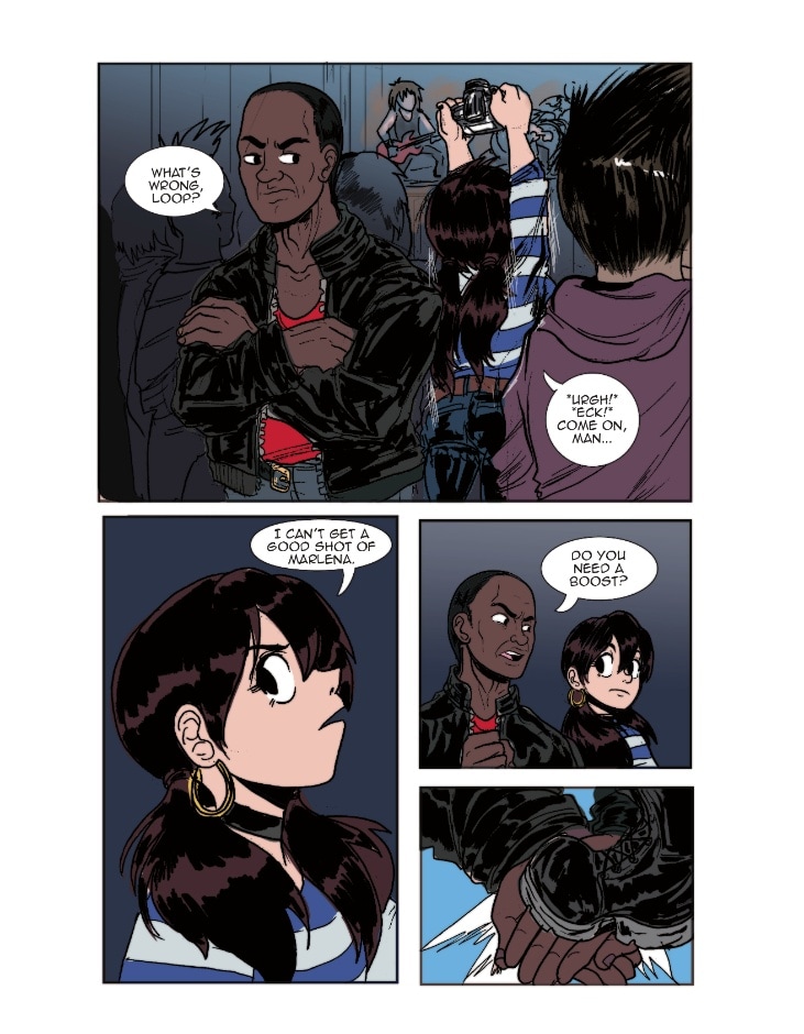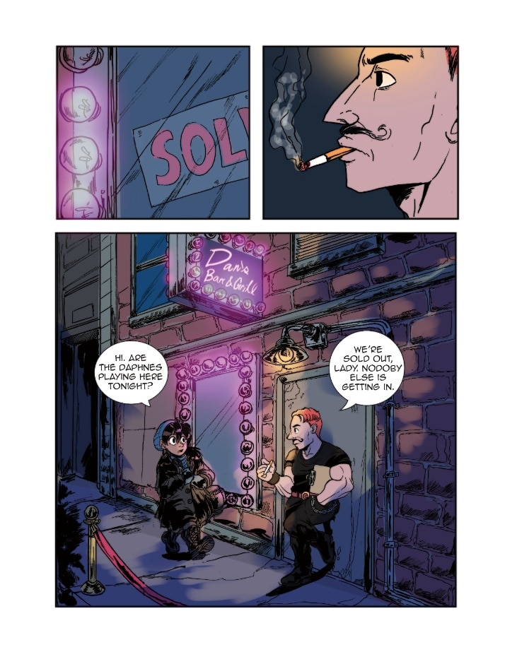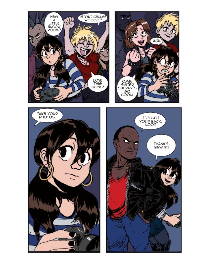 Loop is at a show where The Daphnes are headlining. She snaps a lot of great photos of the band while they’re playing. It's a good thing that Bryant was there to watch her back!