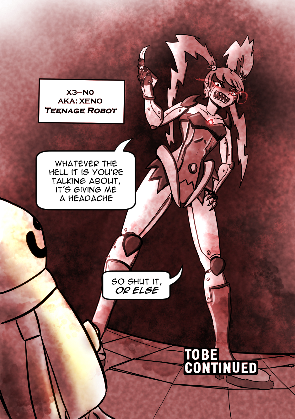 New comic! Still plan to work on Dragon's Bounty, but I had this idea of 'My Life As A Teenage Robot' but she's a bloodthirsty robot killer and had to start working on it.