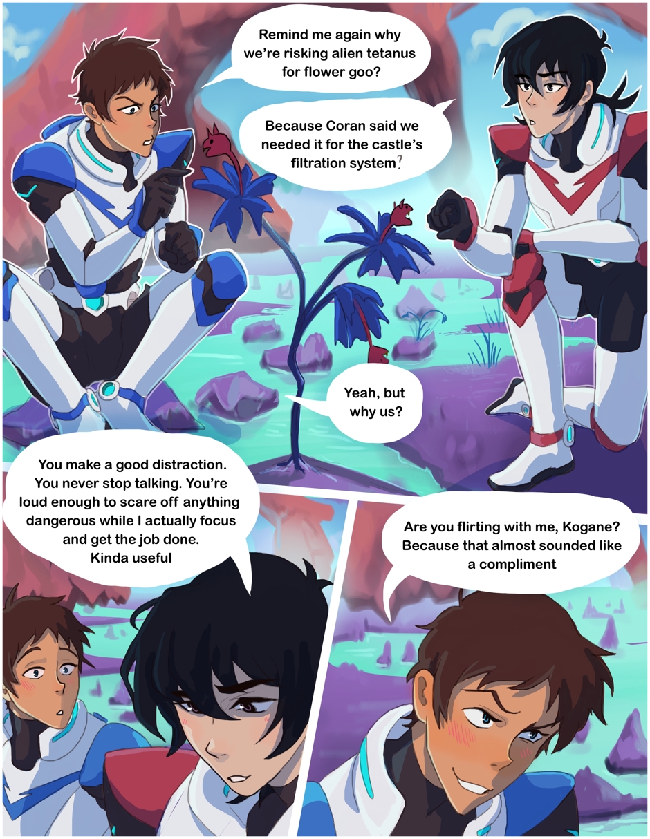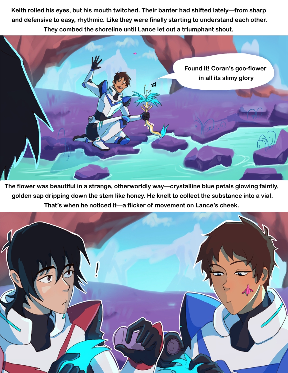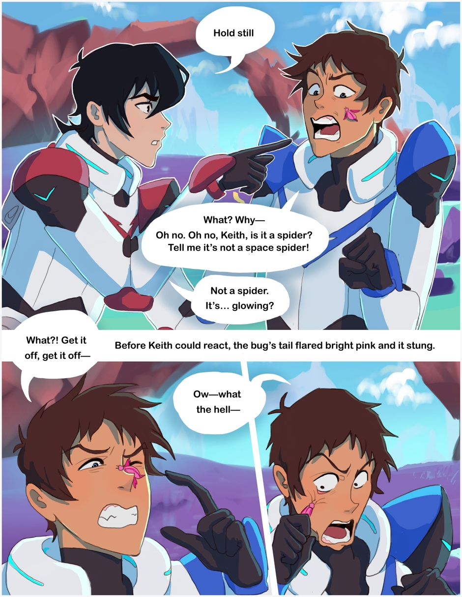 A Klance Love bug au comic featuring Keith/Lance pairing from Voltron! Keith and Lance are on a brief mission on an alien planet collecting supplies when suddenly Lance gets bitten by a love bug, causing him to absolutely torture Keith with affection. Keith is sure this is how he dies. Both boys are pining idiots. Enjoy!