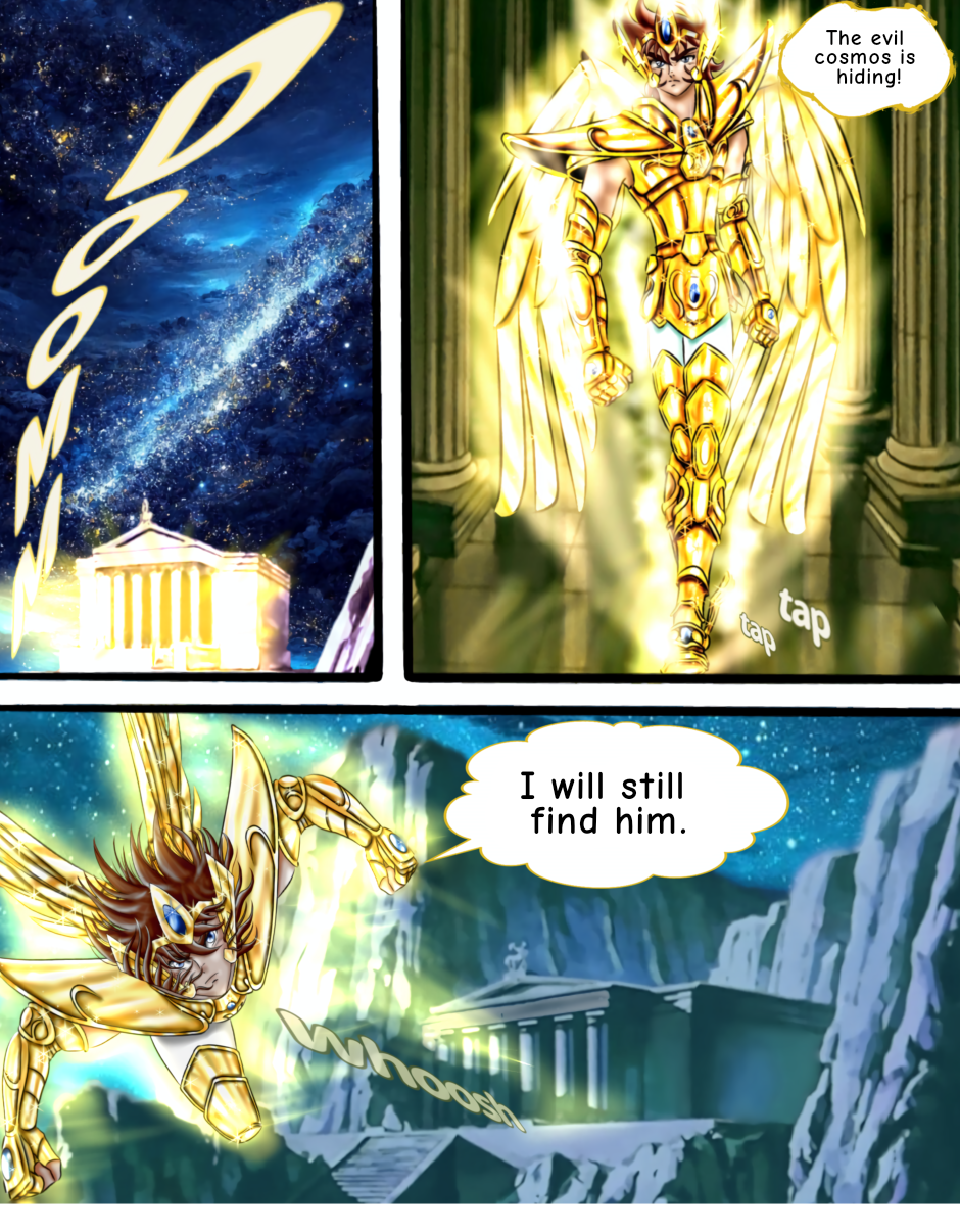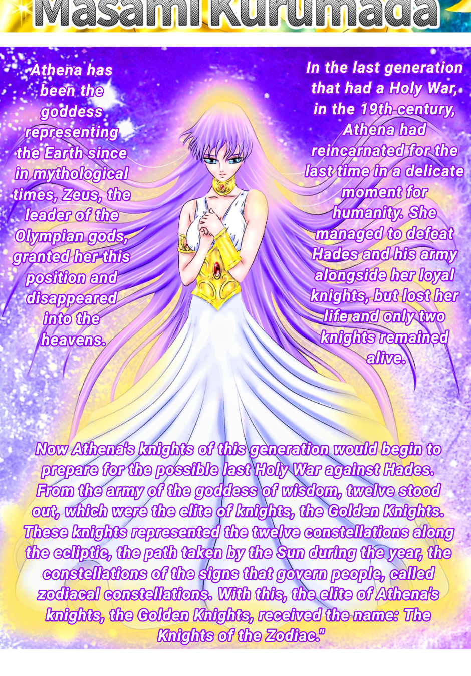 This story shows the events before and during of the Holy War between the goddess Athena, goddess of wisdom and ruler of the Earth and Hades, god of Underworld, in a Universe in which Gemini Saga is not disturbed by an evil spirit and his brother Kanon is unsuccessful in his initial ambition. With Golden Knights as protagonists and main focus, This story tells, in addition to wars, adventures and events that result in a change in fate of some characters.