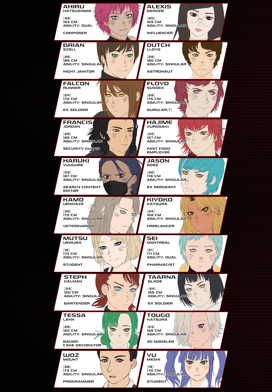 I like what I see so far. The story seems interesting enough. At first, I thought it might start out like a battle royale setting, but in that case, it would be of no use for anyone to go to the psychiatrist after the competition. I actually don't find it too hard to read so far, I had expected worse after you mentioned that. The character boxes are fine as well, but I'd suggest creating a tableau or glossary or something like that. That way reader could look up information faster between the chapters as there is a lot of information giving about numerous persons all at once. I probably didn't memorize half of it in the first read.