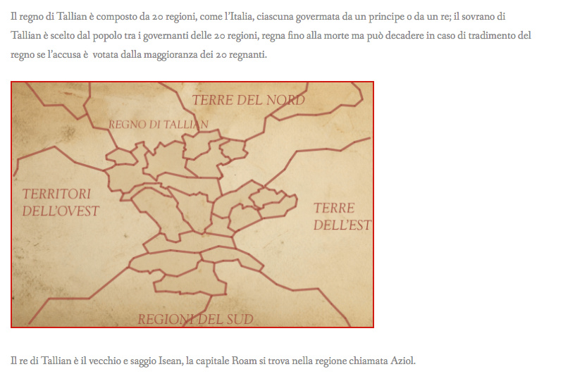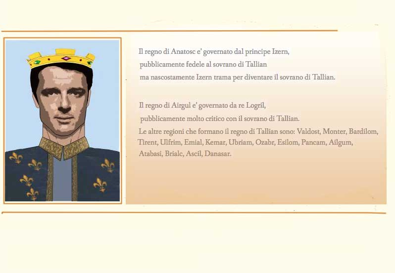 Il regno di Tallian è composto da 20 regioni, come l’Italia, ciascuna govermata da un principe o da un re; il sovrano di Tallian è scelto dal popolo tra i governanti delle 20 regioni, regna fino alla morte ma può decadere in caso di tradimento del regno se l’accusa è votata dalla maggioranza dei 20 regnanti.