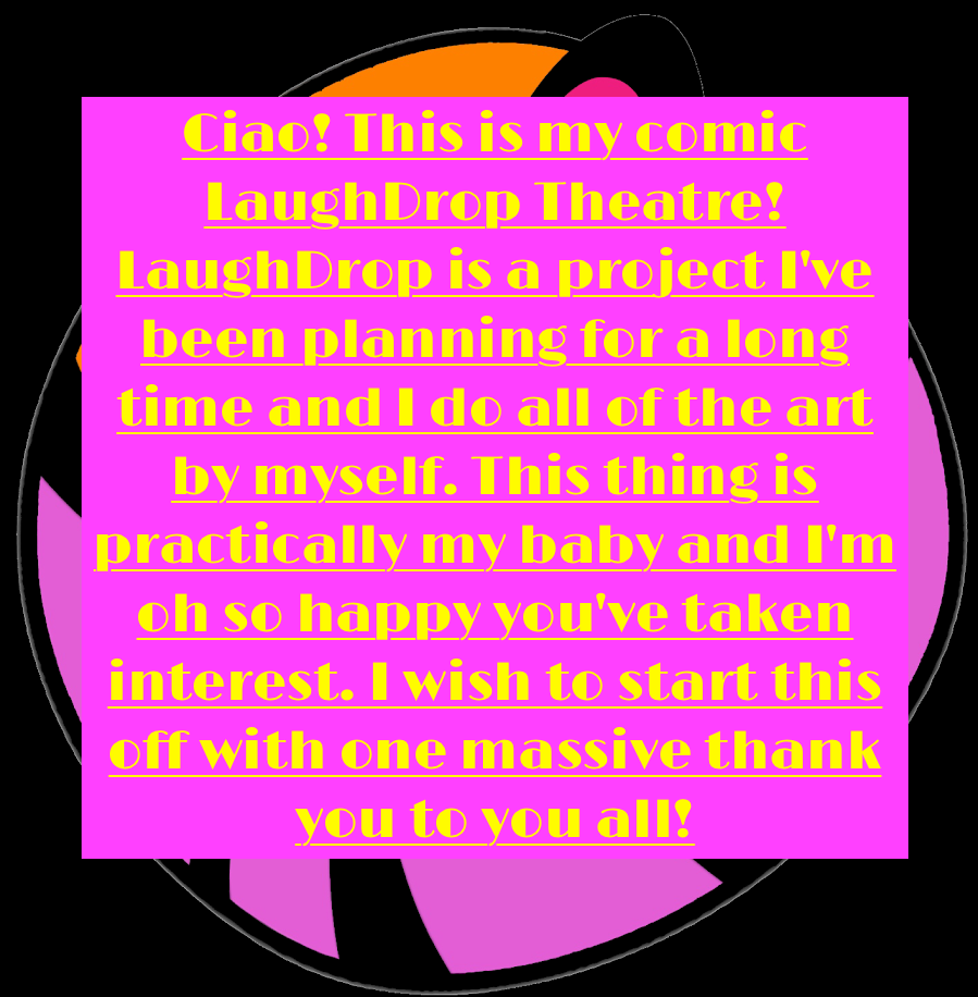 Come one, come all! Follow the boombastical, laughtastical, comment influenced adventures of a tragic girl lost in a comedic world! From a chief made of goop and knives to the crazed moon hanging in the sky, our young protagonist is in for a hysterical ride! Or in normal words, LaughDrop Theatre is a comic, created by Chandler Mitchell, that tells the story of a young girl recently thrown into the adult world learning that everything she knows is a lie and nothing works as she believed.