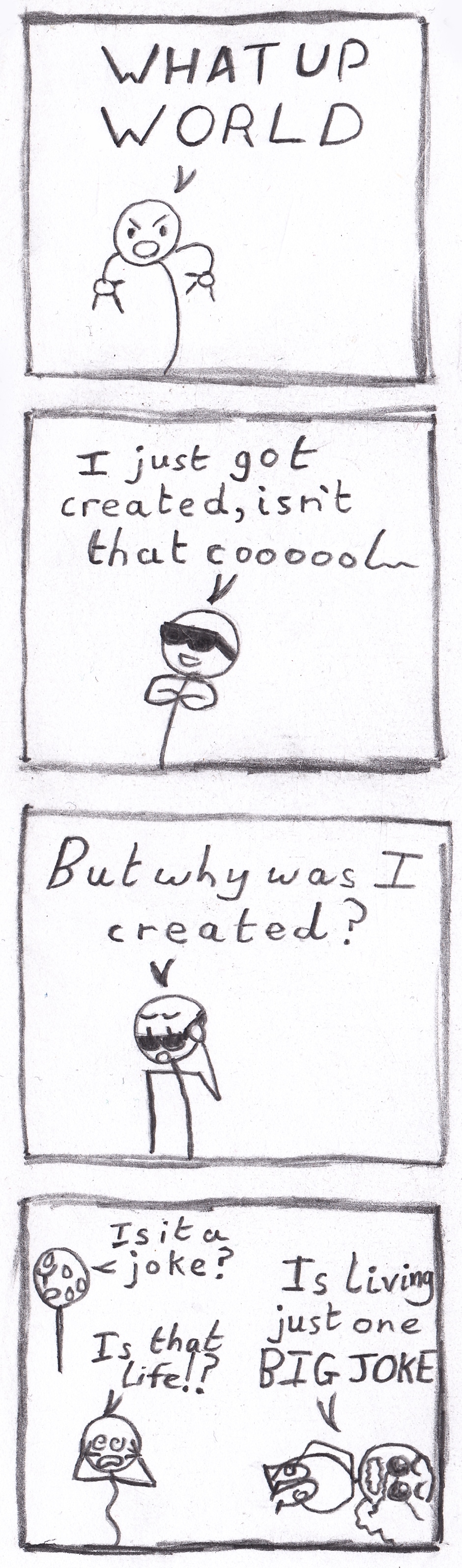 If the comic's gets meta early its not really that funny, like in clr alt del. I think something has to be established before comedy of that works. Also that joke is fairly popular, and ive seen it many times. You have clear handwriting, and what is happening in your comic is easyto read.
