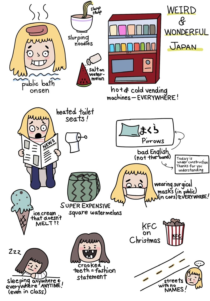 Weird and wonderful Japan! Lots of things here surprise me everyday. Here is a short illustration of things I find weird and some that are wonderful!
