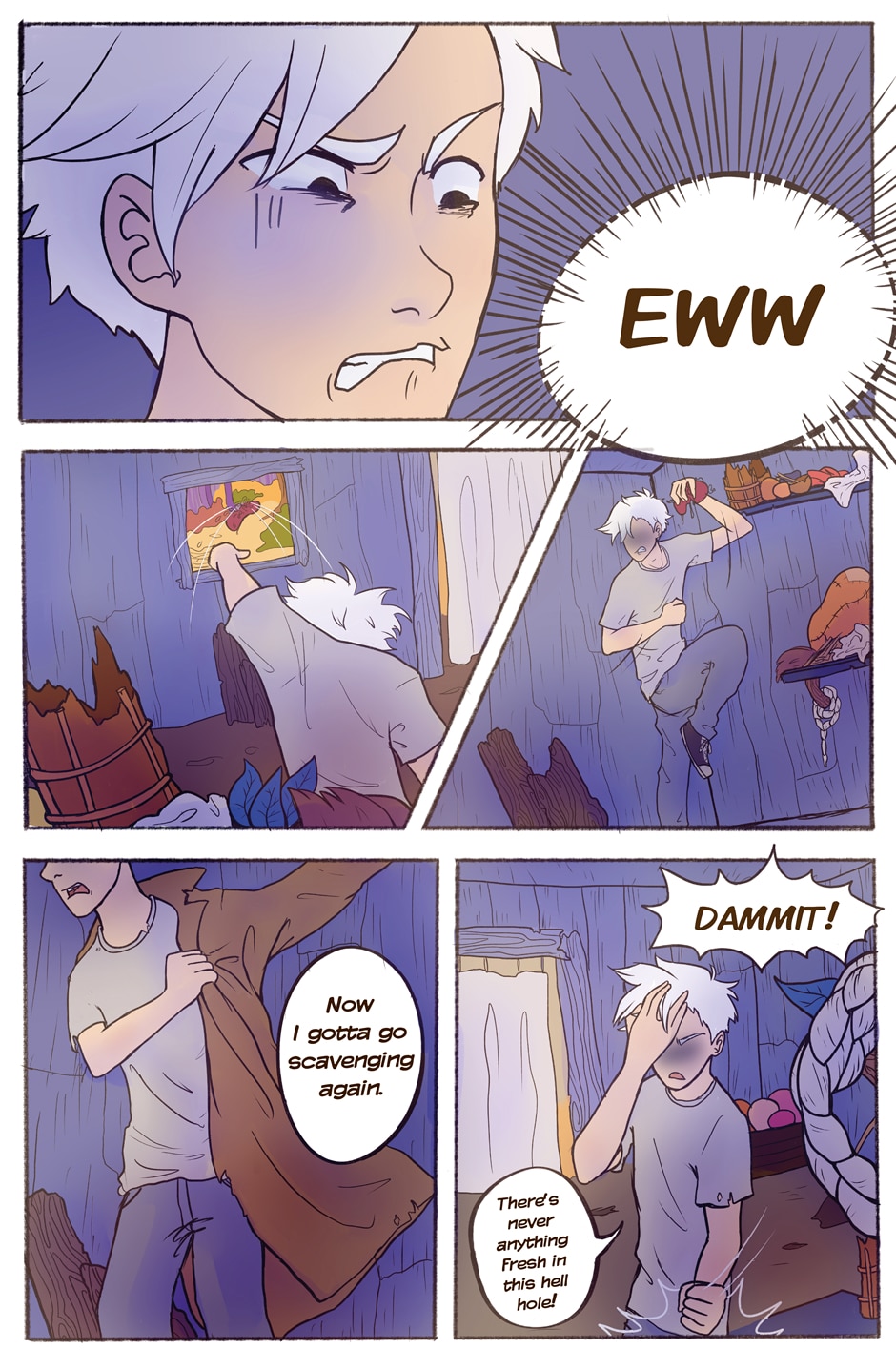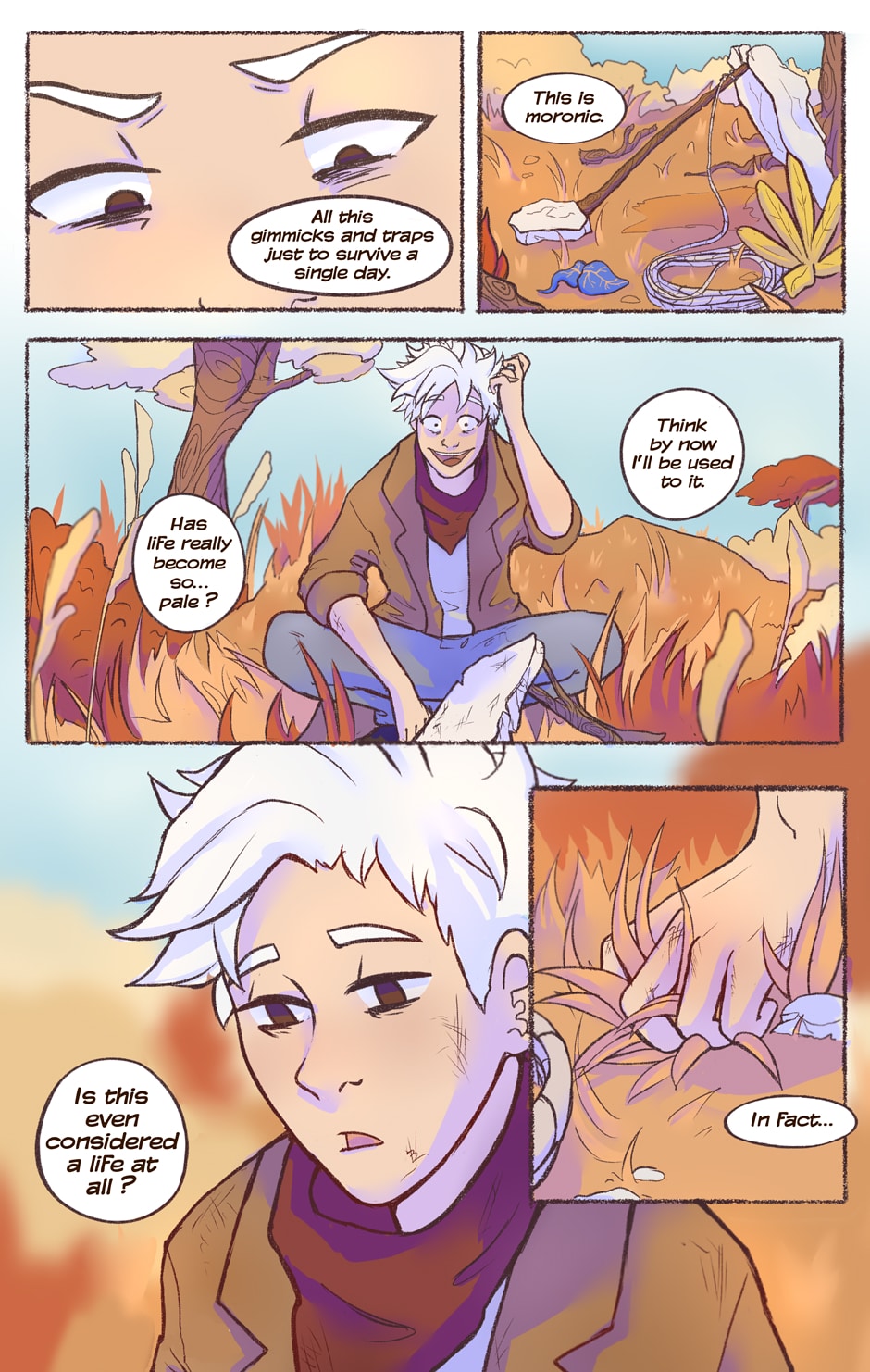 Interesting premise. Question: If he can't kill himself and doesn't need to breath, does starvation and the wildlife really harm him or does fending these off makes things more comfortable?