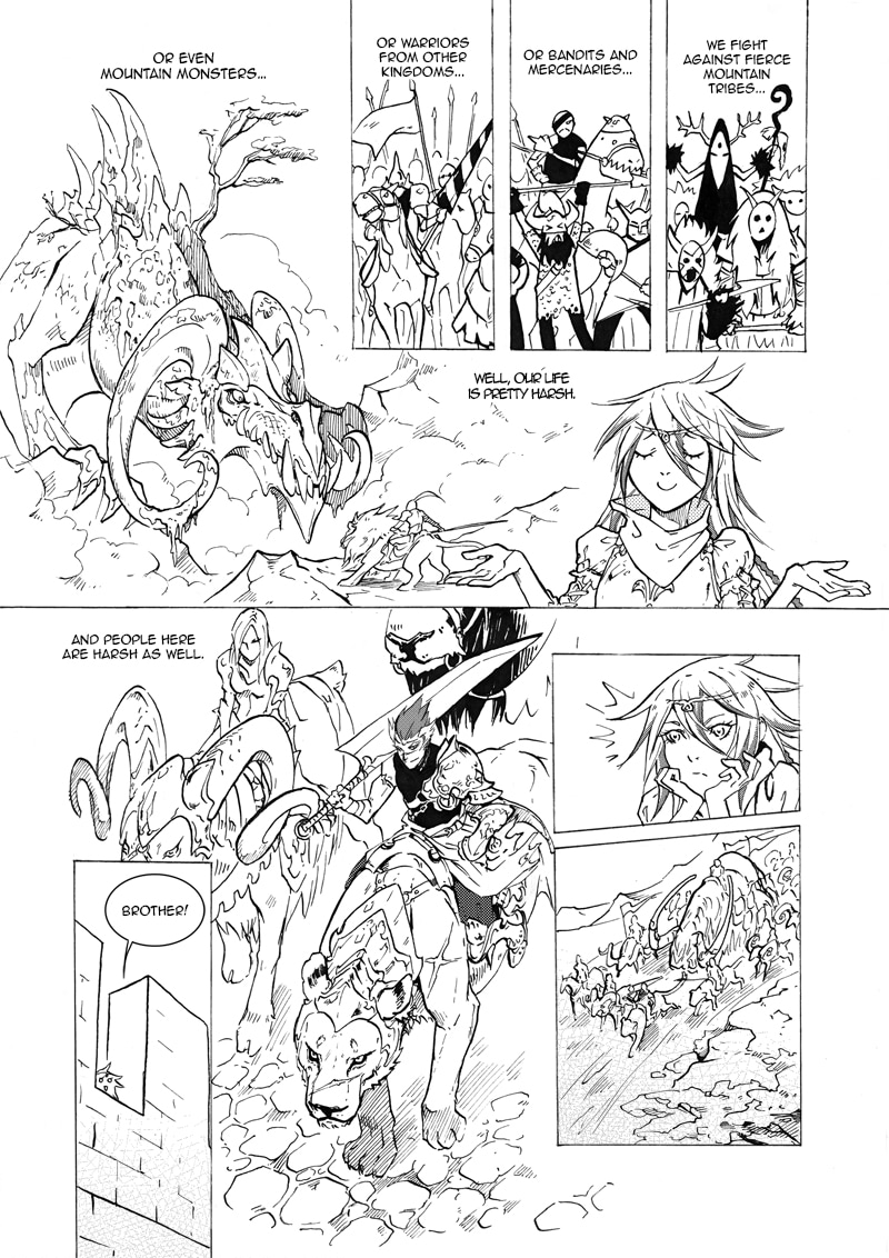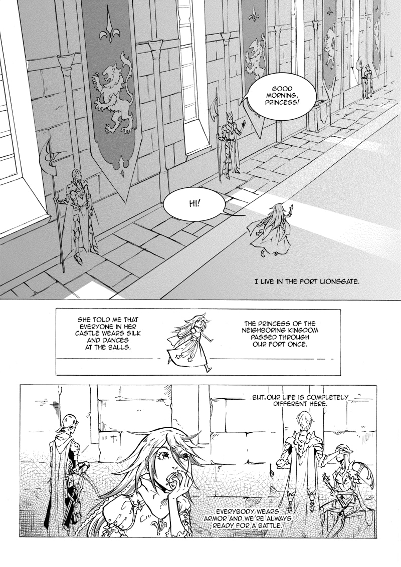 "Lion's Heart" is a small cute story of a little knight princess Estella and a lion cub Lavi. The day they met became the beginning of a big friendship between a girl and a lion. This oneshot was drawn for a contest in 2014. The orientation is Japanese, so please read it from right to left.