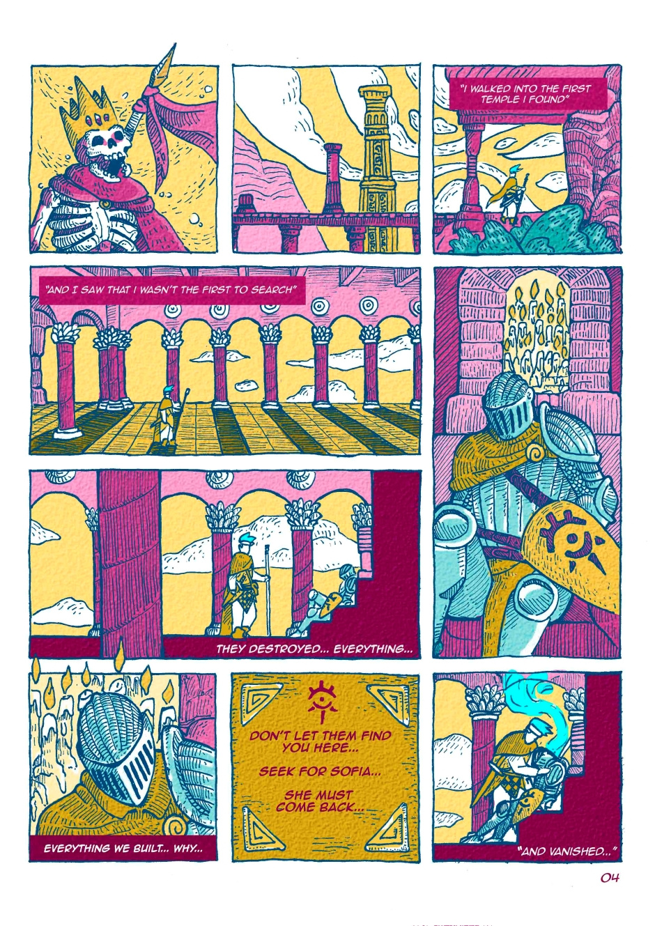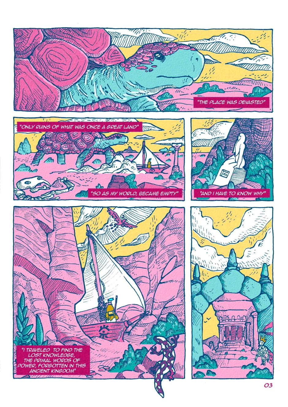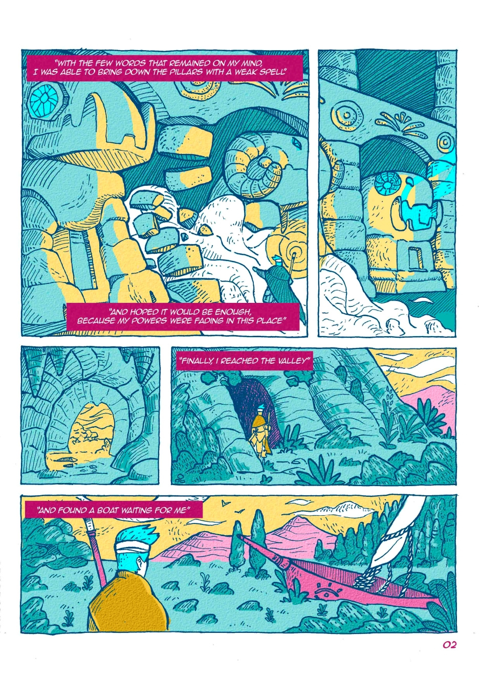 this is an arresting color palette, a cool fit for your textured line work. Some of your panel compositions are quite good and I like the freehand borders.
