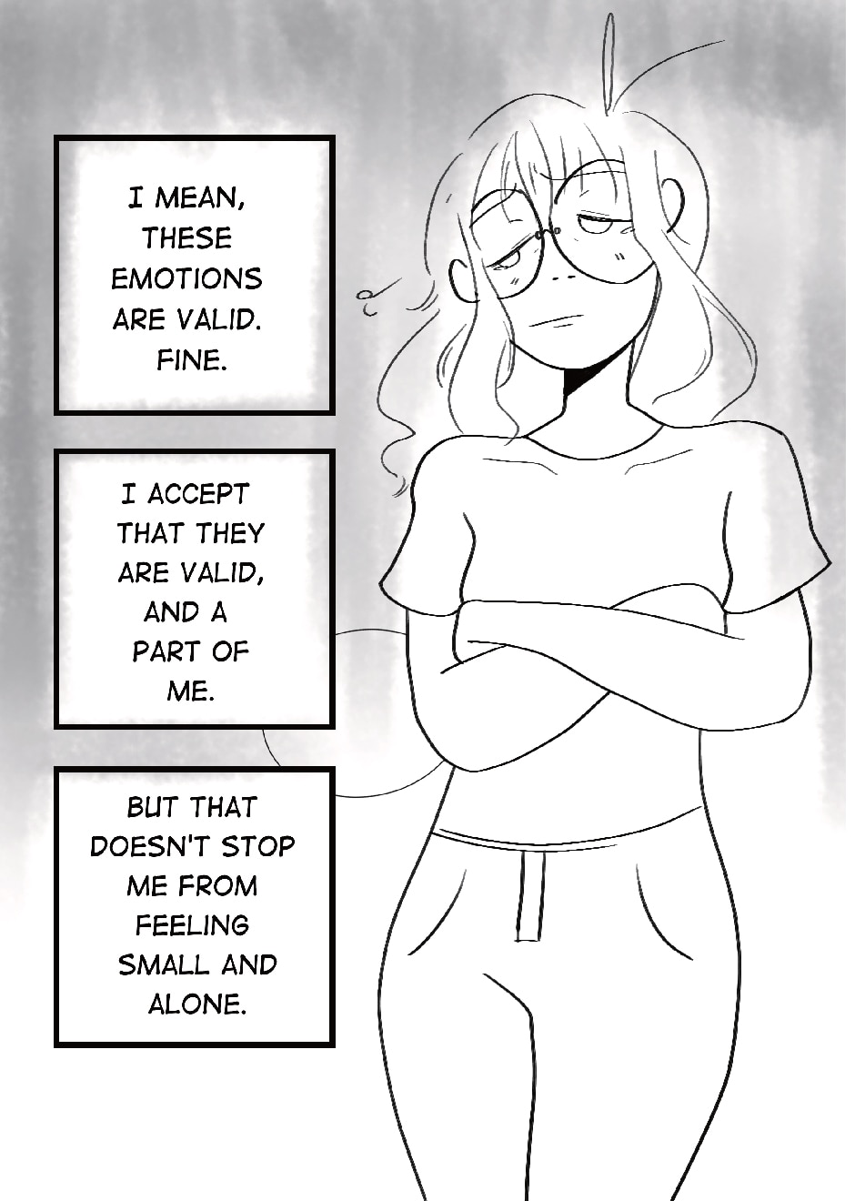 This is a short comic about loving and hating the parts of one's self, then accepting them and moving on.