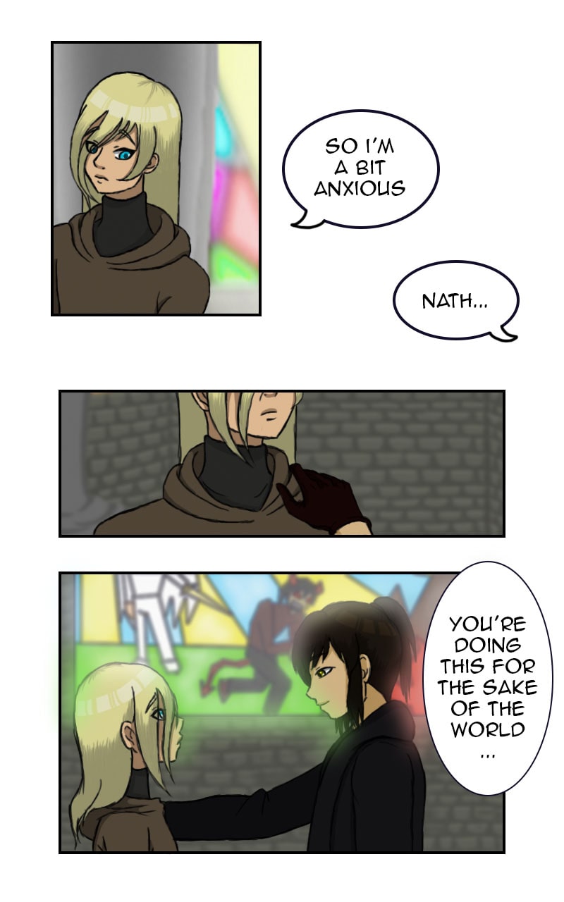 Nathanael was born with strong divine powers. In fact, he discovered them as the world became more and more subject to the assaults of demons. He was then seen by many as the savior of Arcadia, and so he began his journey with his assigned bodyguard, Gall. And there they are, going on a long yet exciting adventure that will be an opportunity for Nath to control his (for now unstable) powers ... and to learn about his mysterious ally...
