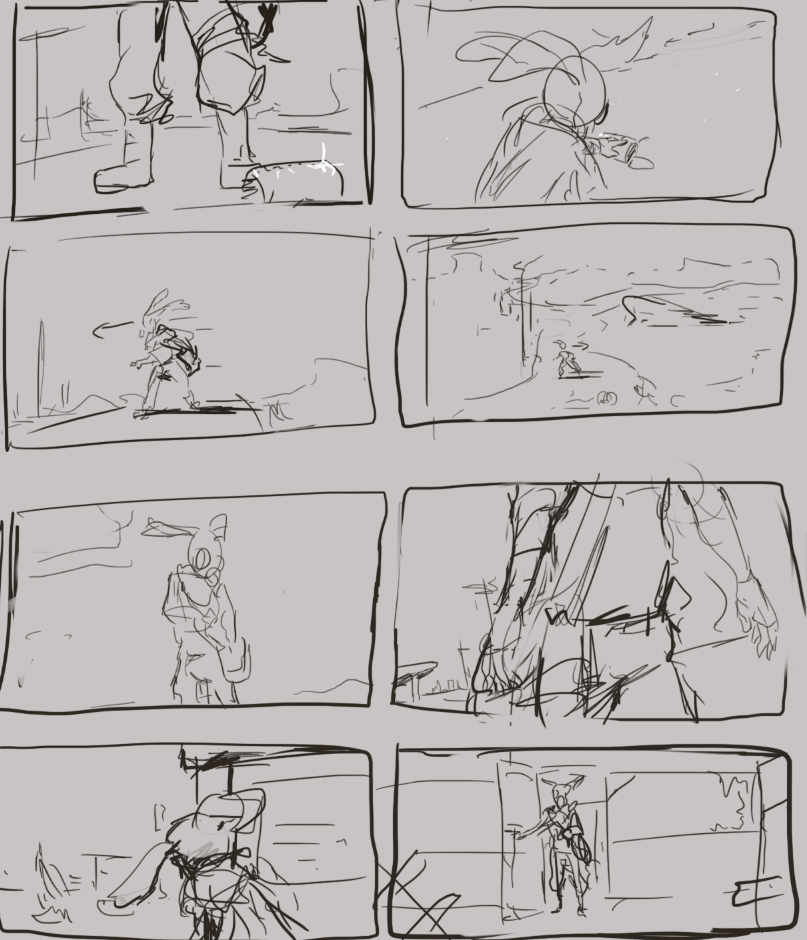 (There are no comic pages drawn yet, only concepts and early storyboard drafts)