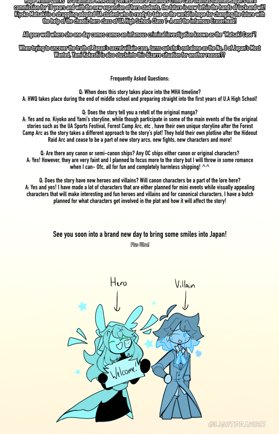 Welcome to the world of My Hero Academia where first- Before the story begins, we meet Kiyoko and Yami as they explain us what to expect from the story in the future!