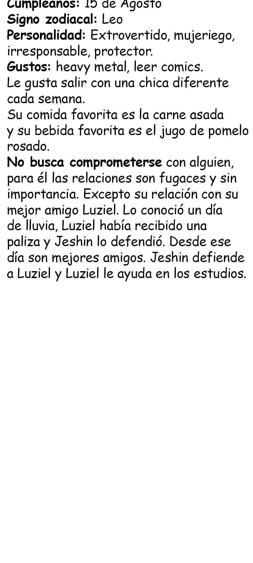 Luziel es un excelente alumno pero por su personalidad tan tímida, muchos chicos lo molestan. Se hace amigo del chico más fuerte de la escuela, Jeshin, y su vida se verá envuelta en muchas idas y vueltas. Ambos son el complemento del otro. La serie es BL, espero que disfruten de esta historia y le den mucho apoyo. Gracias :3