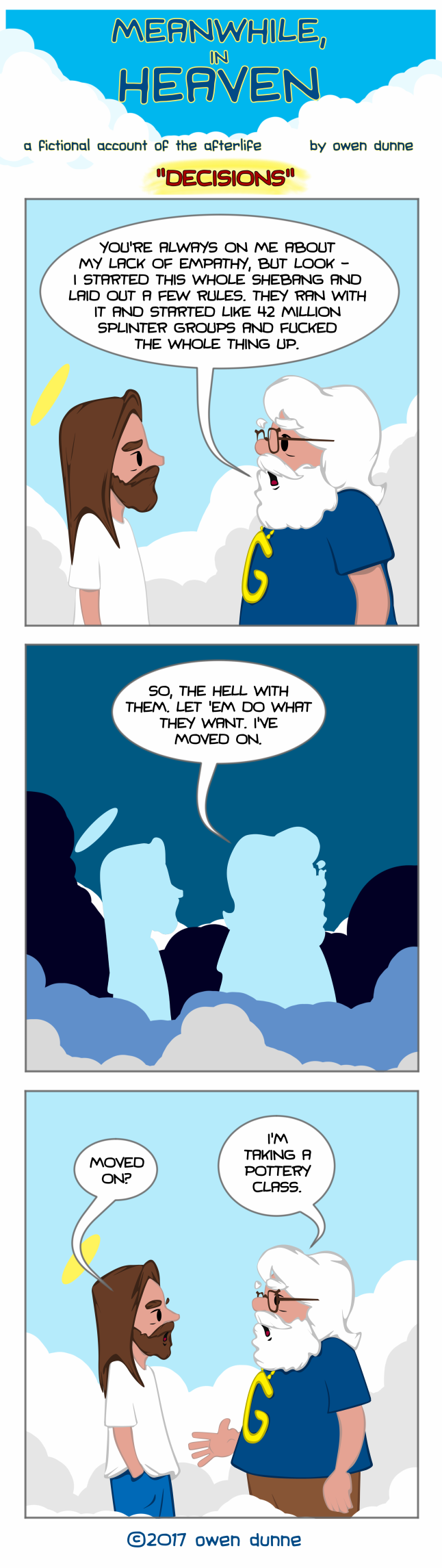 Welcome to Meanwhile, In Heaven! Ever wonder what the Almighty really thinks? What’s really going on up in the great hereafter? Well now you can find out! Join us every Monday, Wednesday and Friday as we follow the adventures of the Heavenly gang! Every M-W-F