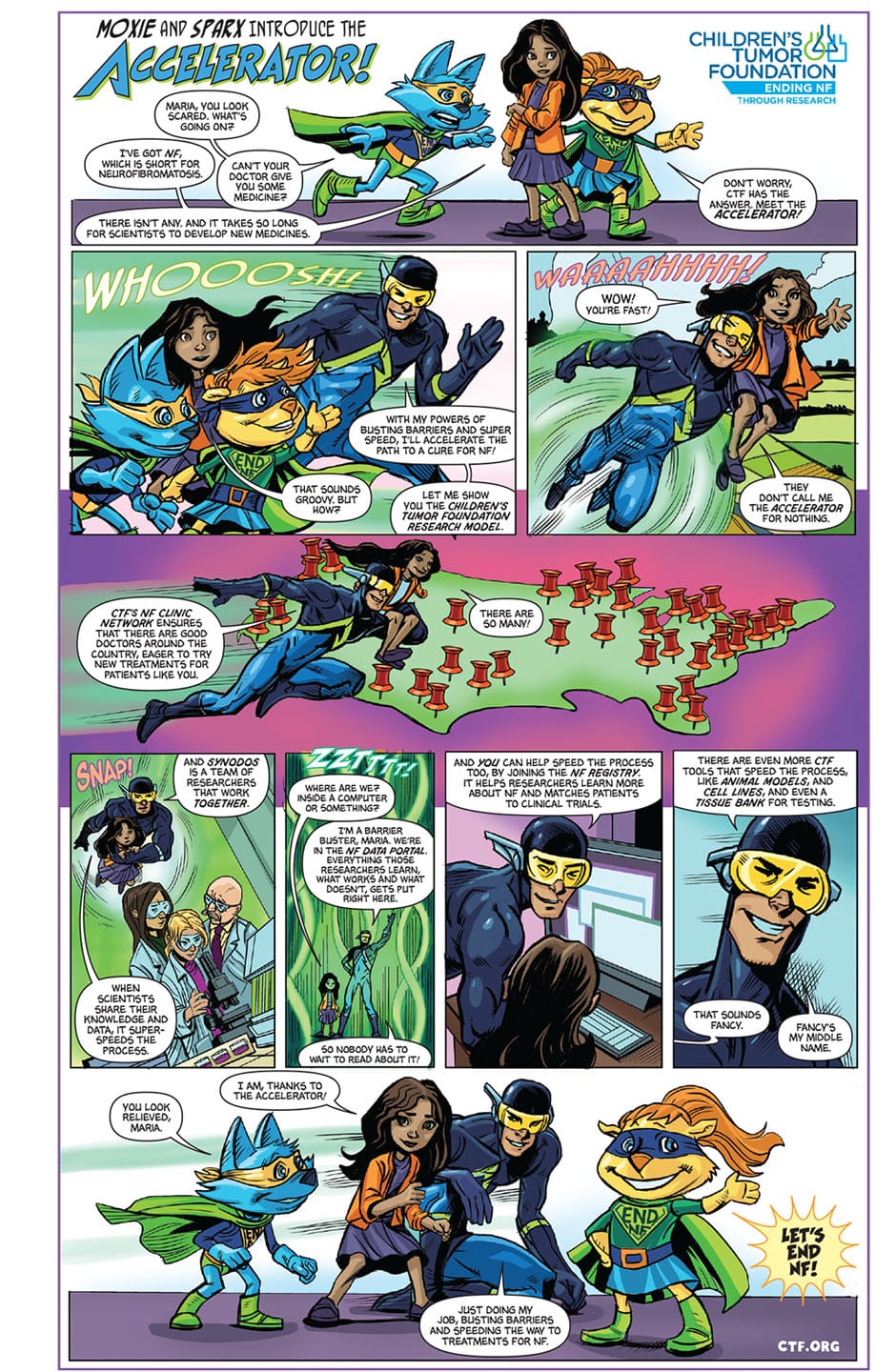 Meet the Accelerator - with his powers of busting barriers and super speed, he'll help accelerate the path to a cure for NF! Download our NF Accelerator comic strip which is a fun introduction to our NF Accelerator Initiative, the next evolution in the Children’s Tumor Foundation’s model of scientific collaboration in finding treatments for NF1, NF2, and schwannomatosis.