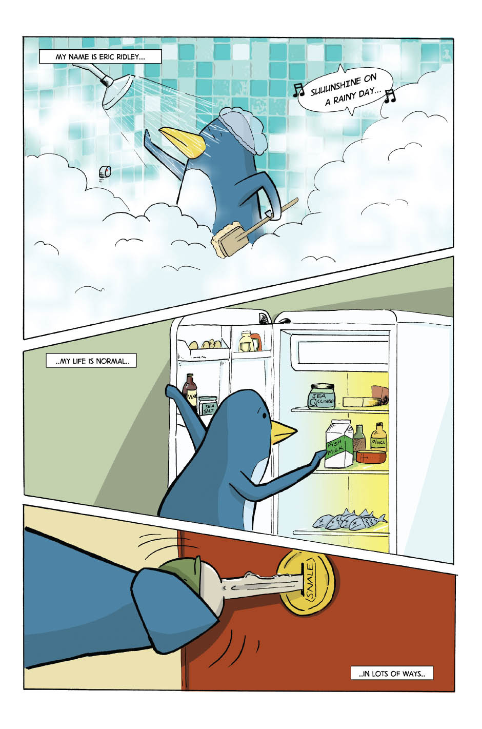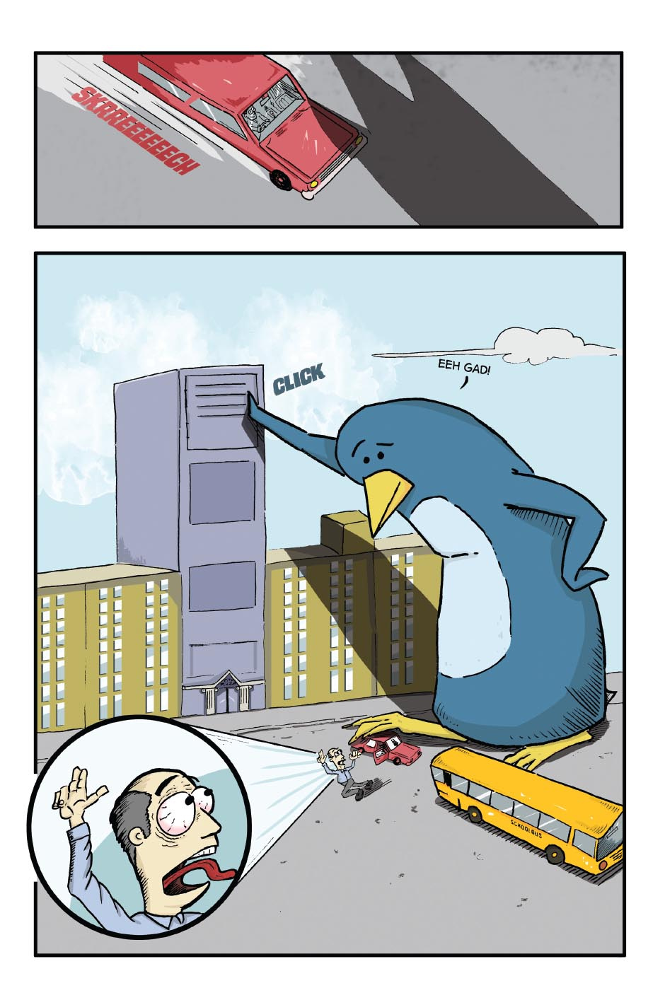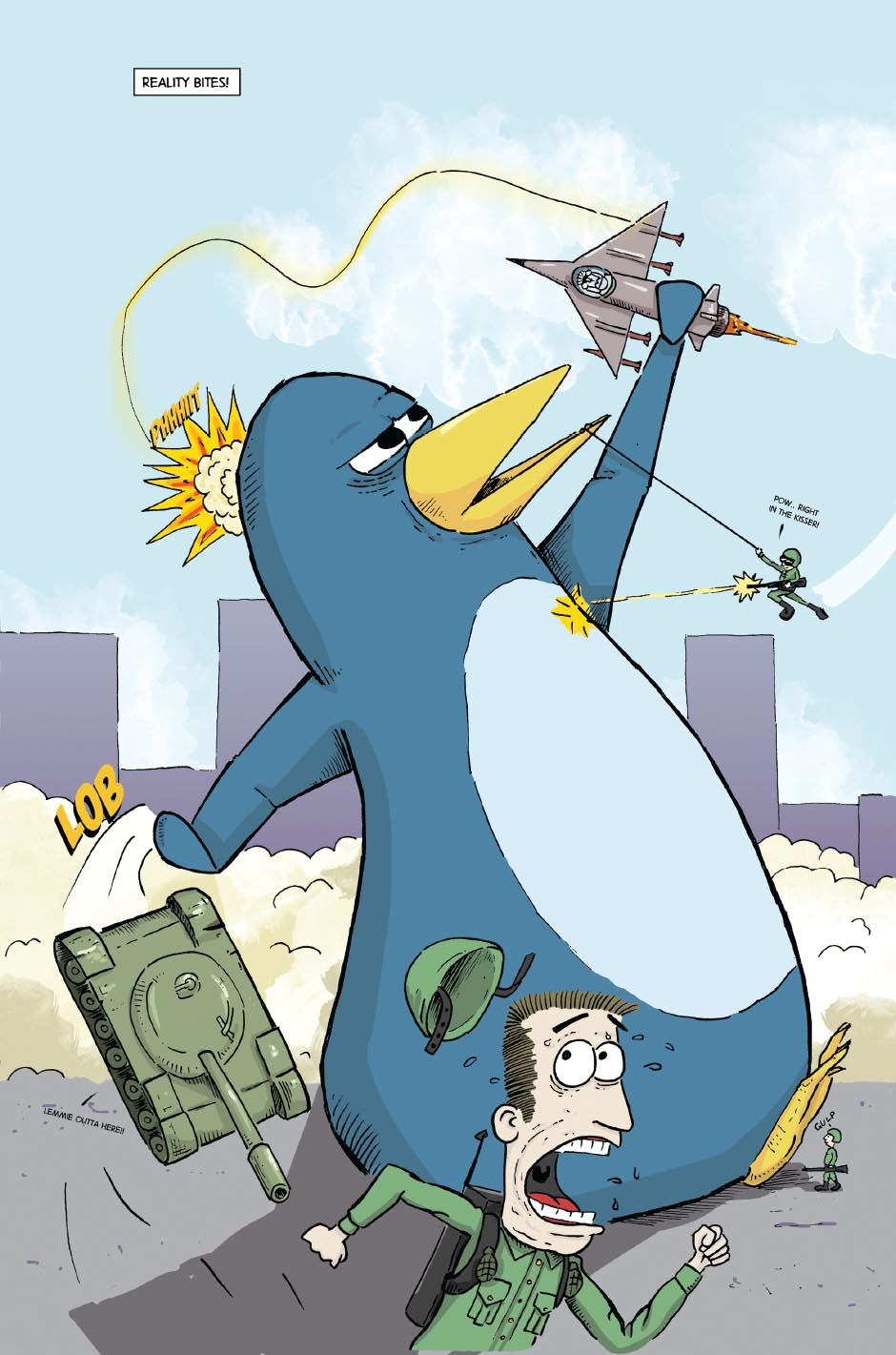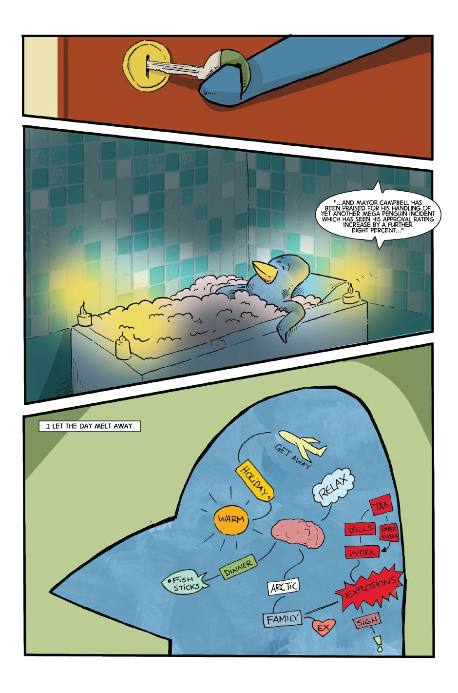 Eric Ridley, the giant penguin goes about his daily business – which happens to be the chaotic destruction of Mega City.. A fun little tale, for all ages.