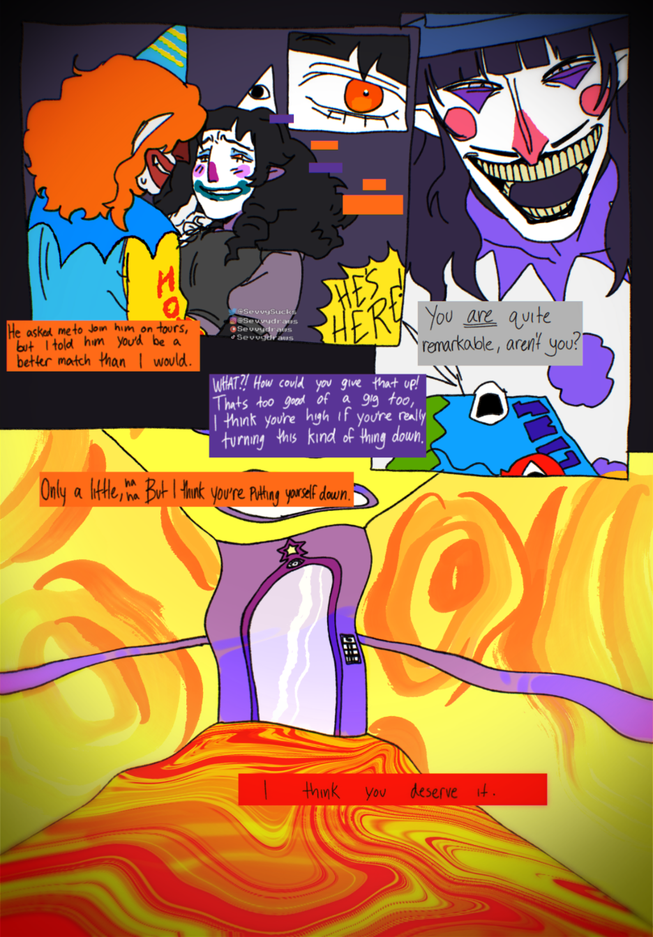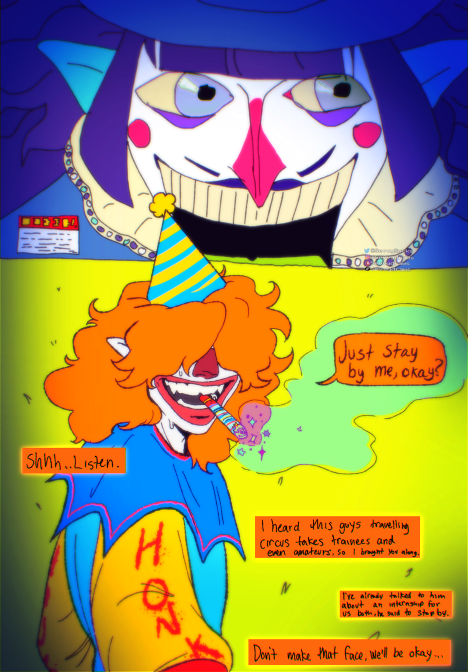 This is a series of lore that takes place throughout my character Lurch’s current life, dreams and memories. Since he is the only clown character of mine that has met all of my other clown OCs at some point, I decided he’s the perfect one to use to use for this story!