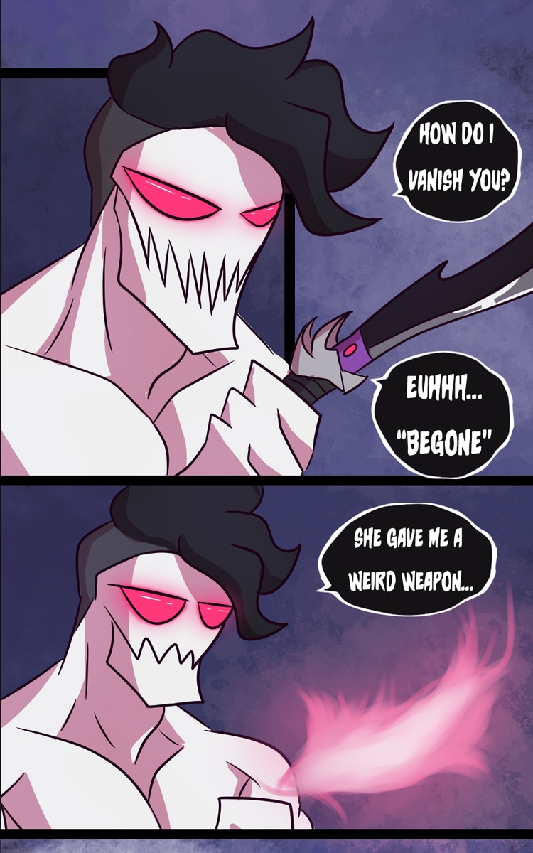 A young girl on a quest ventured by herself into a cave to acquire a potion ingredient gets captured by a group of bandits. These bandits have unsavory plans for the young girl. Before she was about to see her end, she was saved by a monster clad in black greaves and purple tunic. She decided to travel alongside the monster, which took him a moment to consider. All along their journey, they uncover both the thriving and blooming regions the grim and morbid undertone of this world.