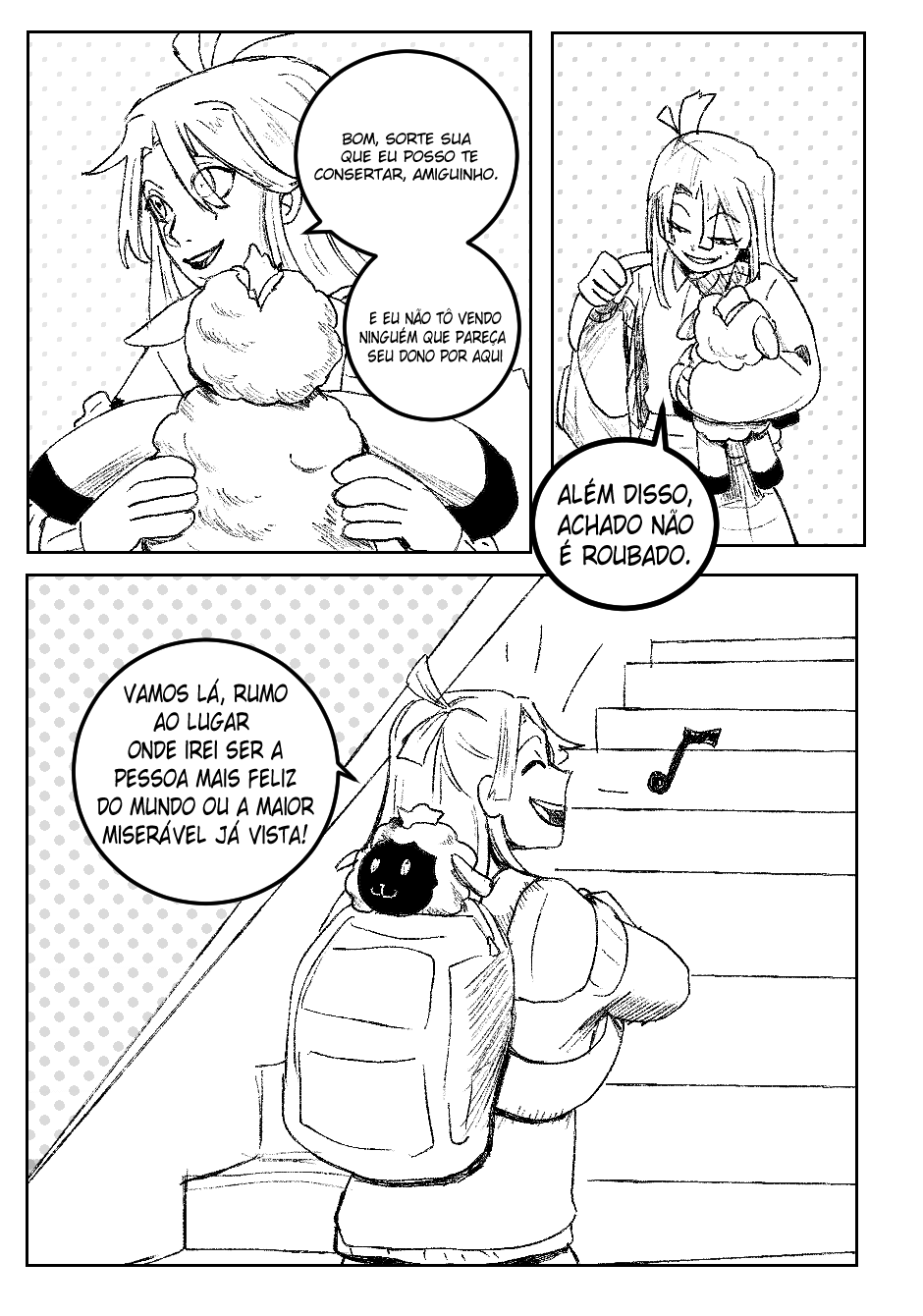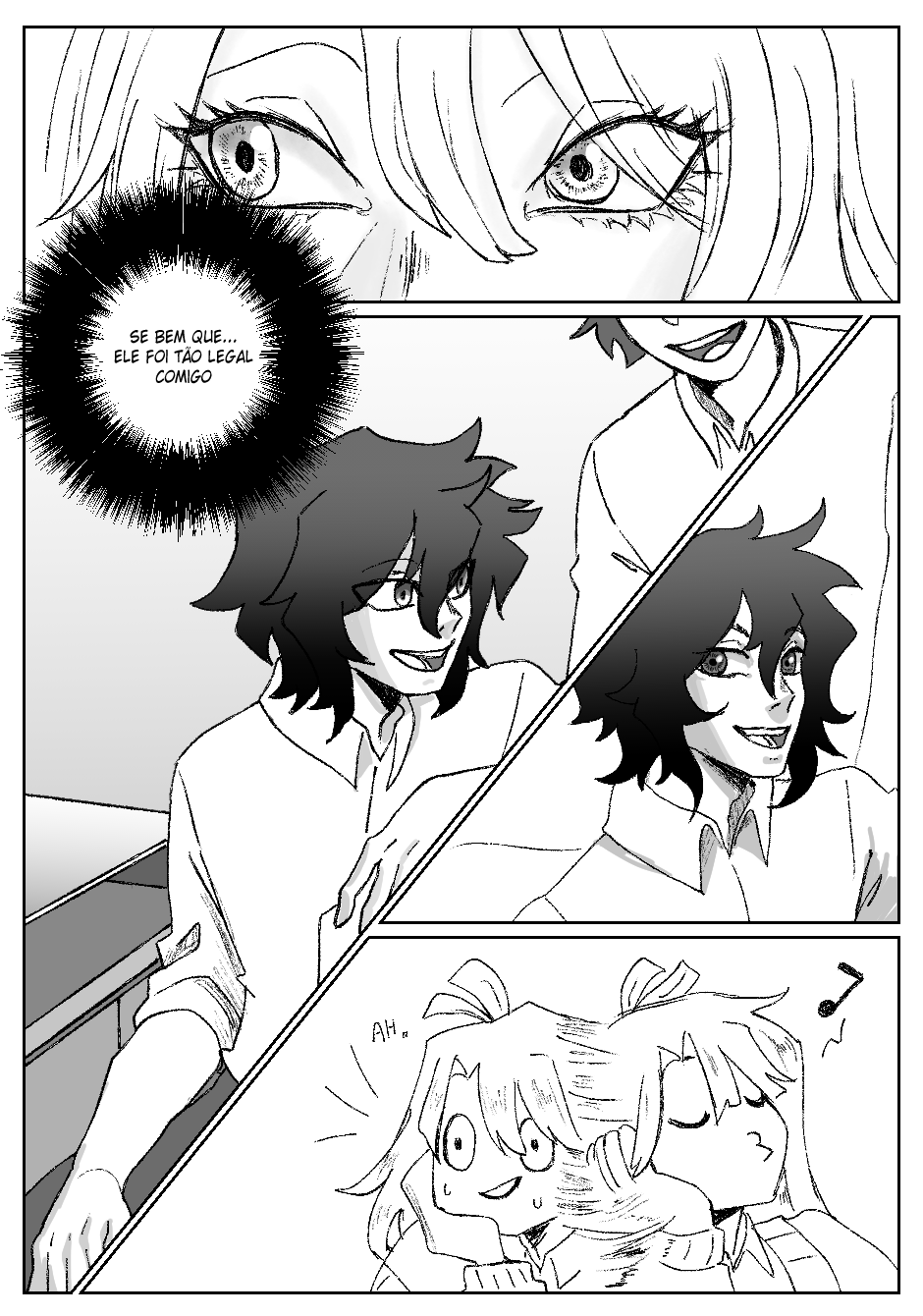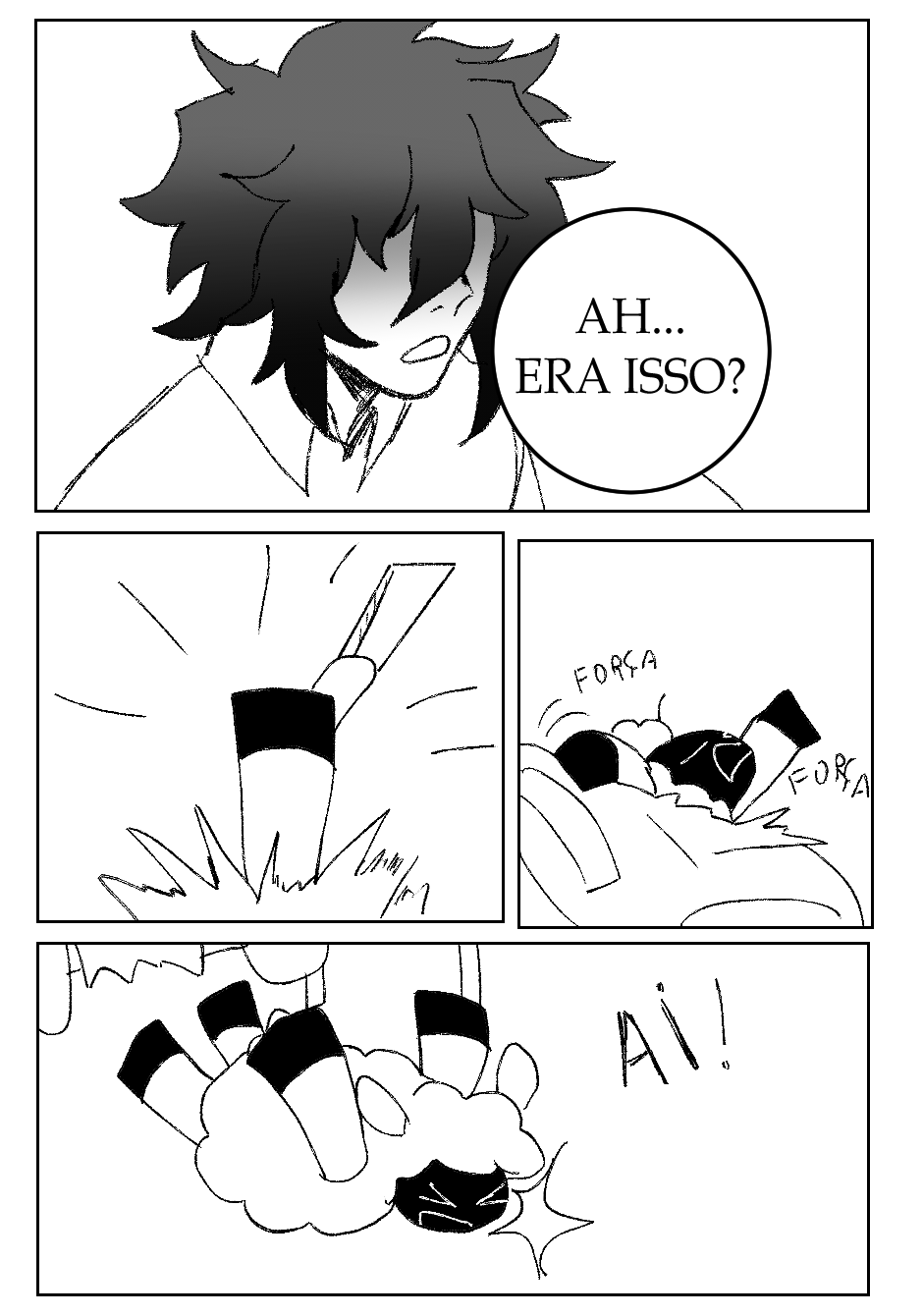 Fora isso, as ações estão bem claras, legíveis, e achei que você soube fazer uma narrativa visual bem boa de modo geral. Talvez pudesse focar um pouco mais na transformação do menino no penúltimo quadrinho? Somente o penúltimo quadrinho pareceu um pouco confuso. Não sei se seria do seu interesse alterar ou não.