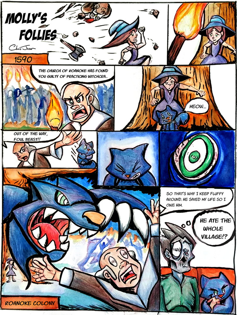 Molly's Follies is a funny online cartoon about a young witch named Molly and her supernatural werecat Fluffy living in modern day Salem. Living beyond the Salem Witch Trails and the Roanoke Colony, Molly is trying to have a discreet life while continue to practice as a witch. Fluffy, on the other hand, doesn't hide the fact that he is supernatural, being and enjoys life to the fullest while causing chaos. Molly's Follies chronicles their lives as they adapt to the modern world while trying to not reveal the supernatural that goes on in Salem.
