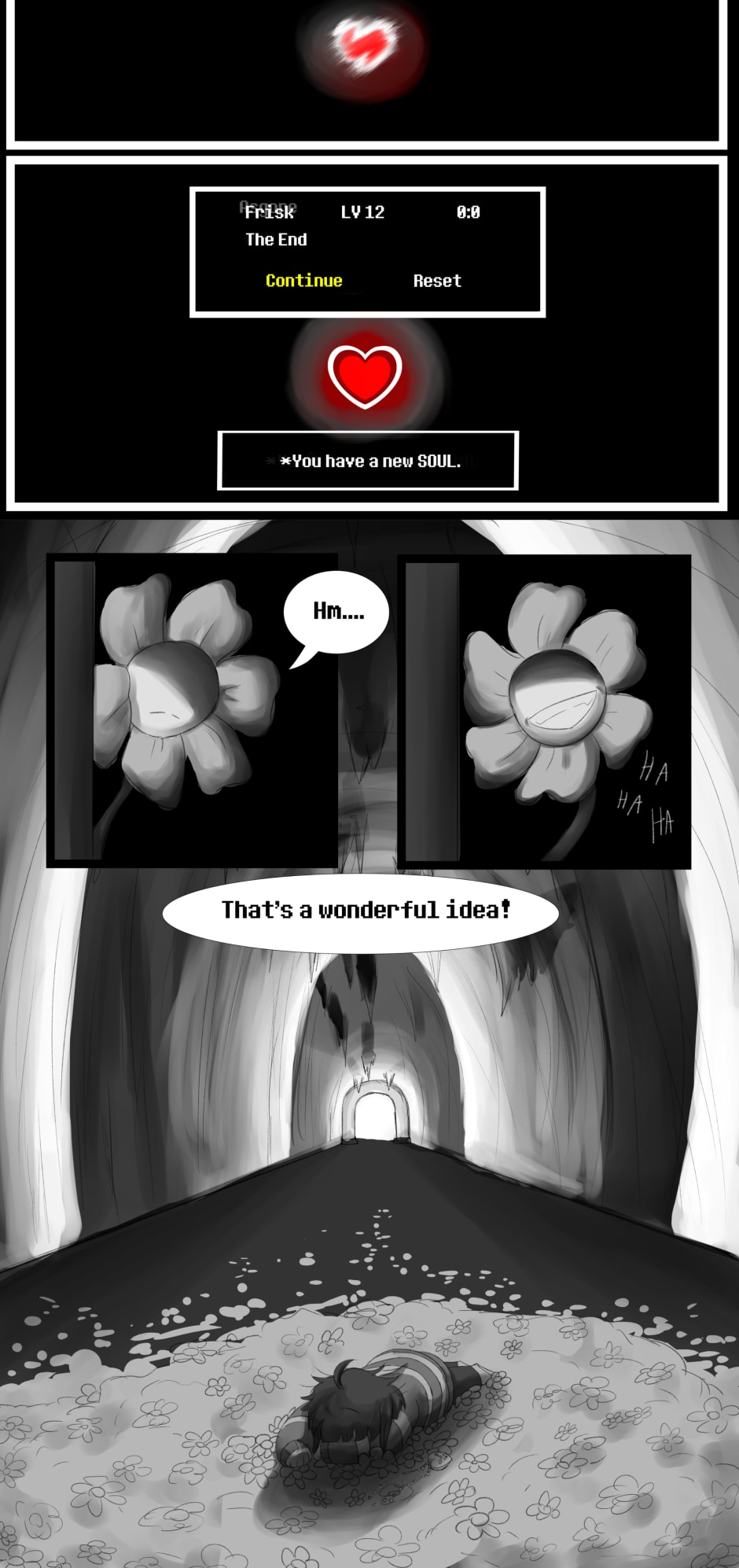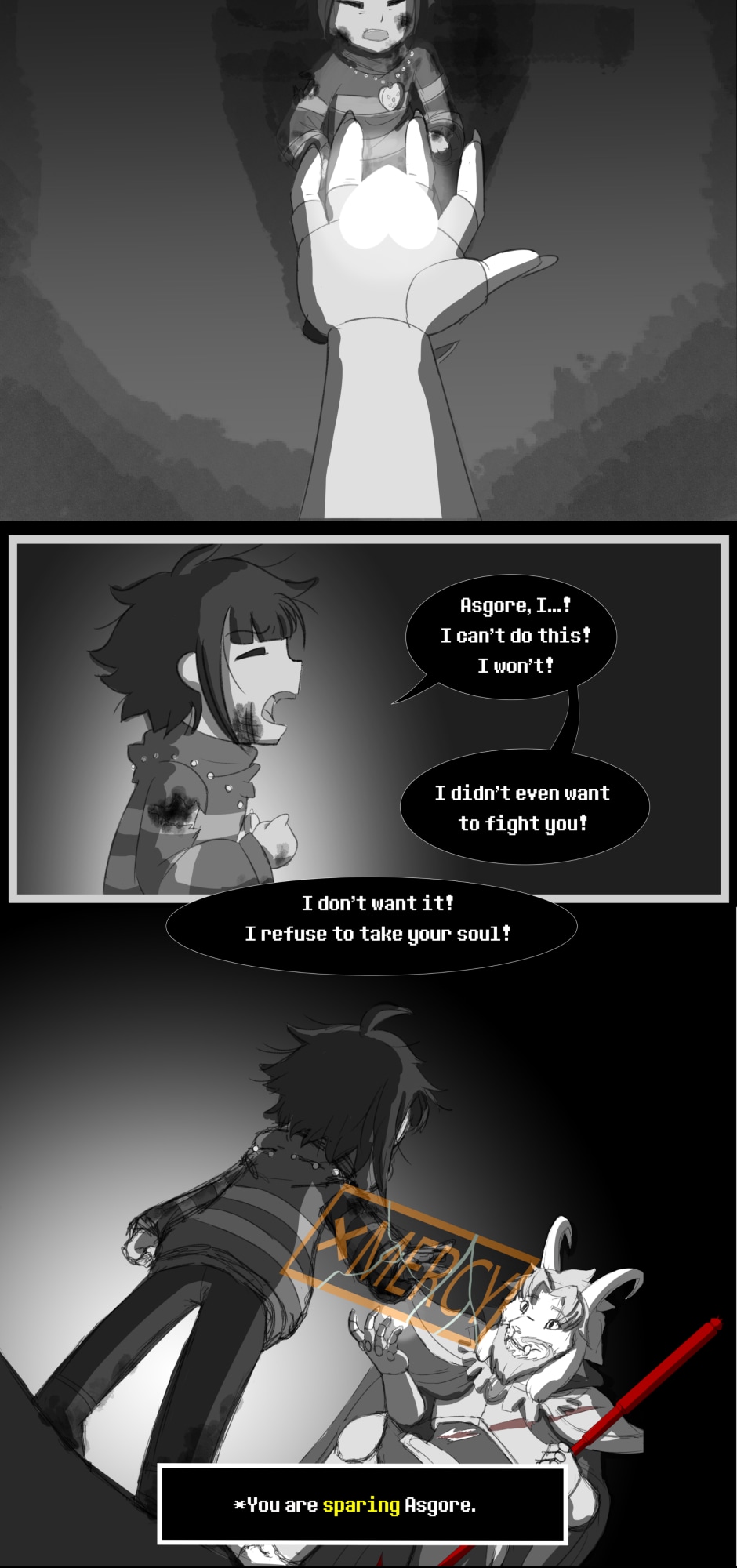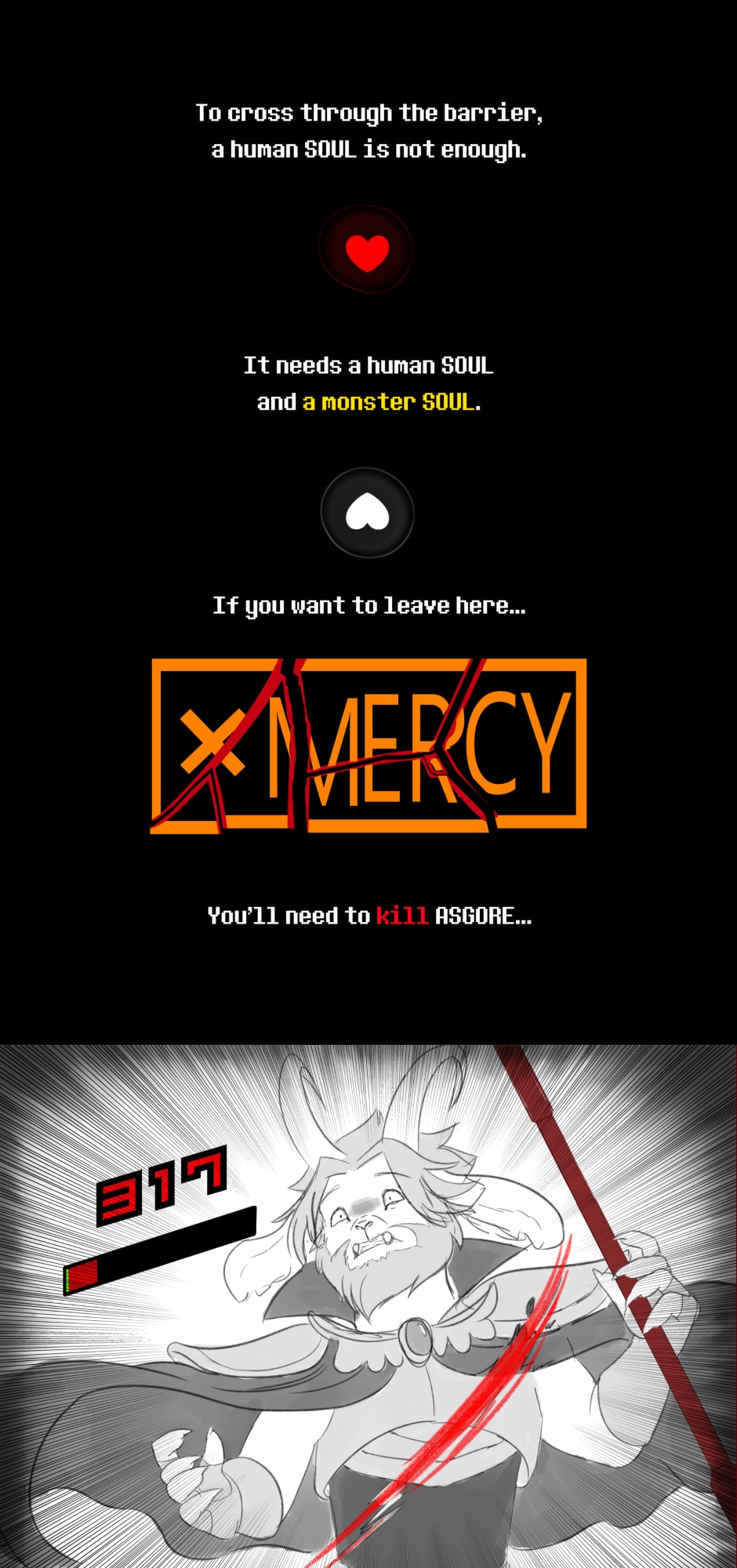 After RESETting, Frisk found themselves having to travel alone through the Underground once more, in a attempt to leave that Kingdom without more sacrifices. However, their final confront with Asgore took an unexpected turn when the king of monsters decided there was only one way to end the conflict between humans and monsters, once and for all...